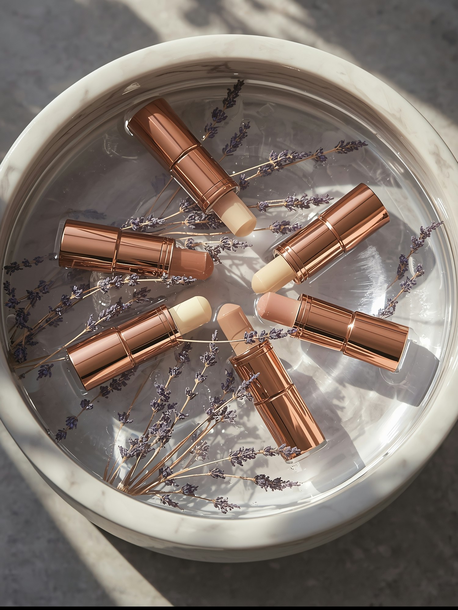 Elegant rose gold cosmetic sticks with creamy shades, arranged with lavender in a marble dish filled with water, under soft sunlight.