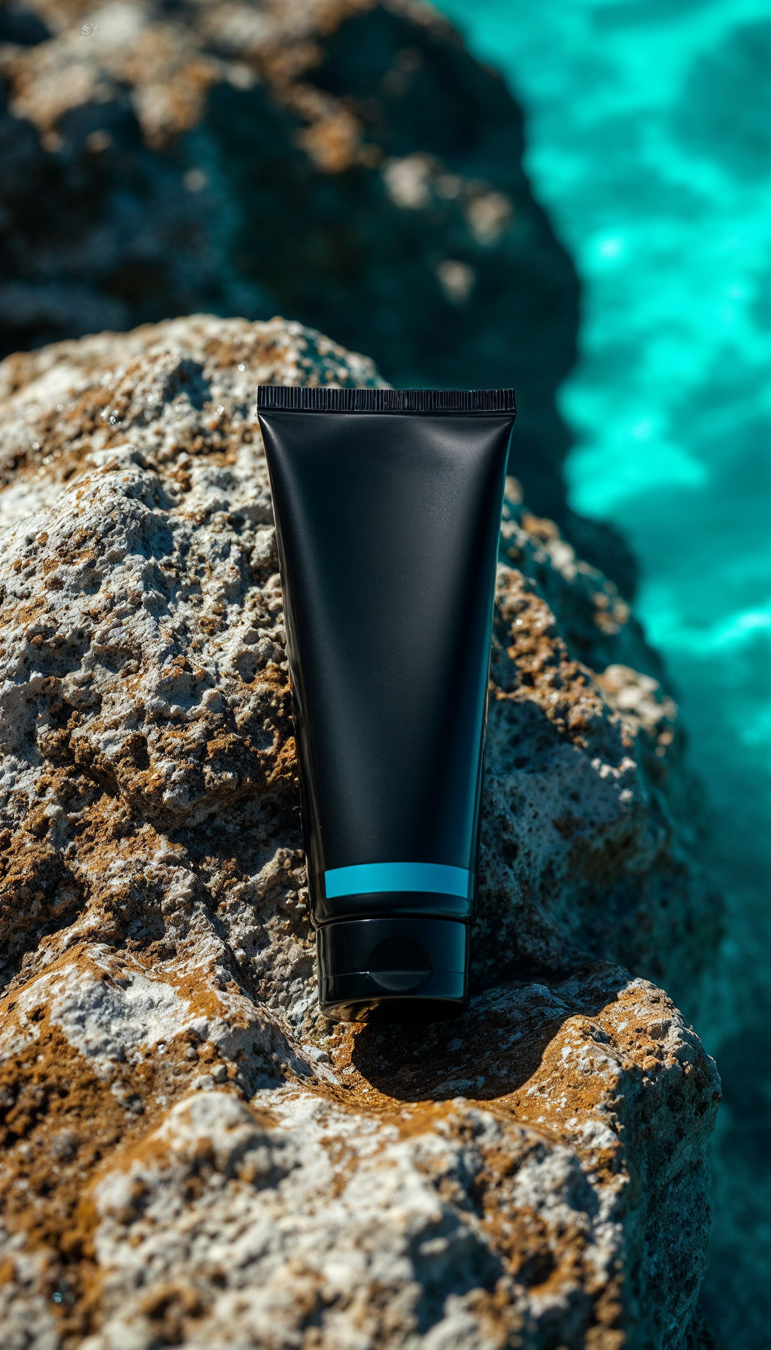 Black tube with blue stripe on sunlit rock by turquoise water, creating a striking contrast in a natural setting.