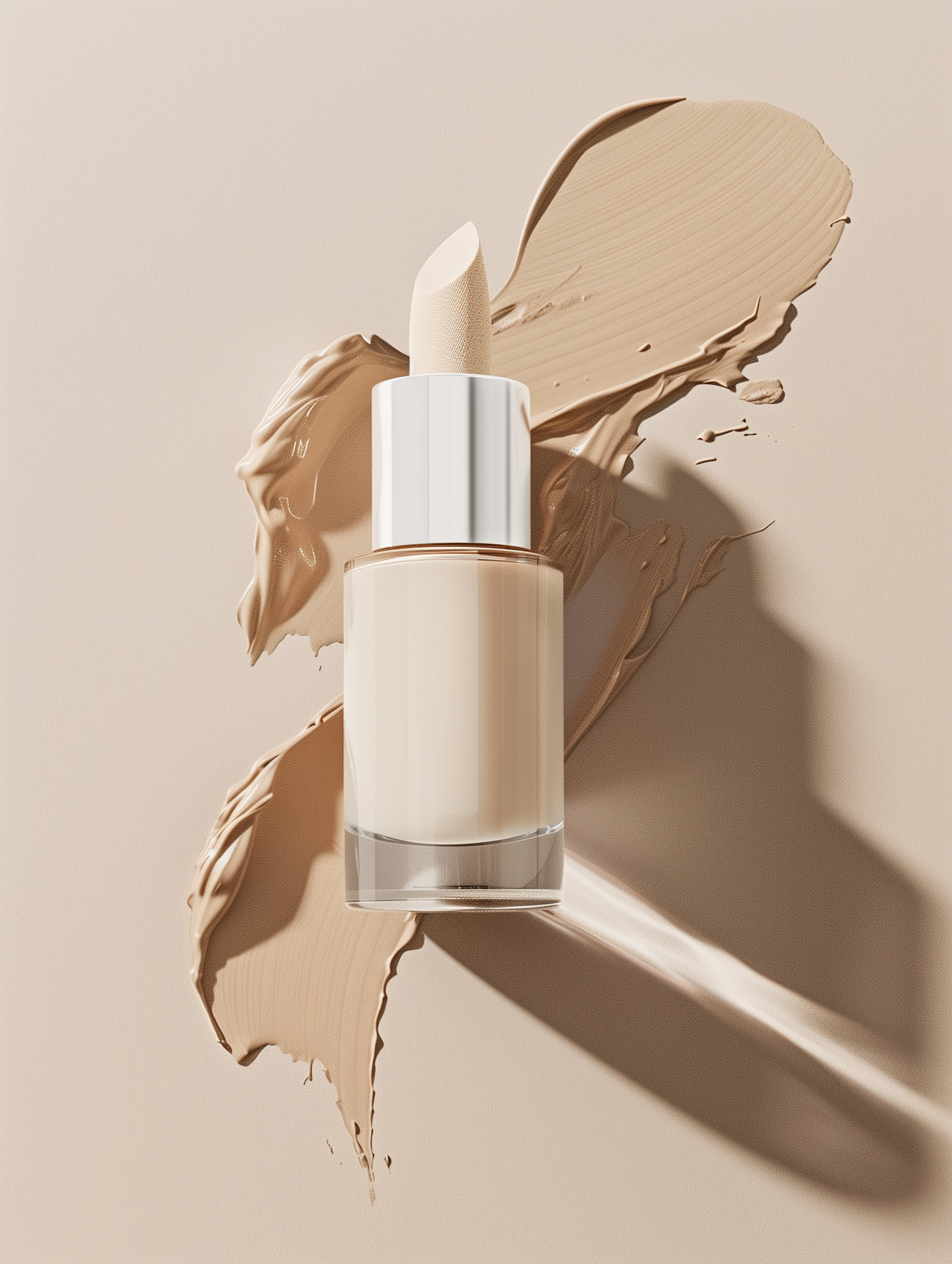 A sleek bottle of foundation against a textured backdrop, showcasing its smooth consistency in a natural beige topical spread.