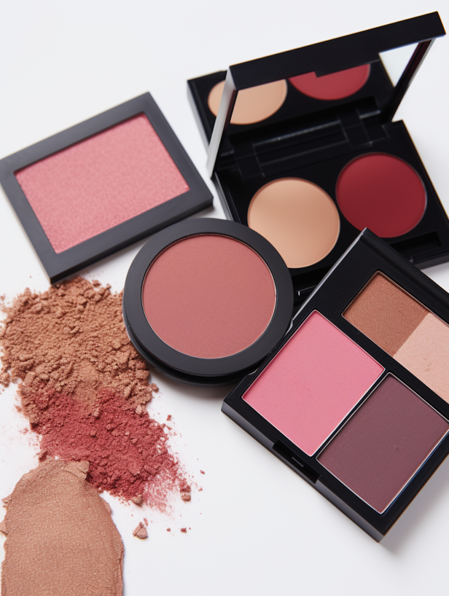Vibrant makeup collection with blushes and eyeshadows in pink, red, and brown shades, featuring sleek black packaging.