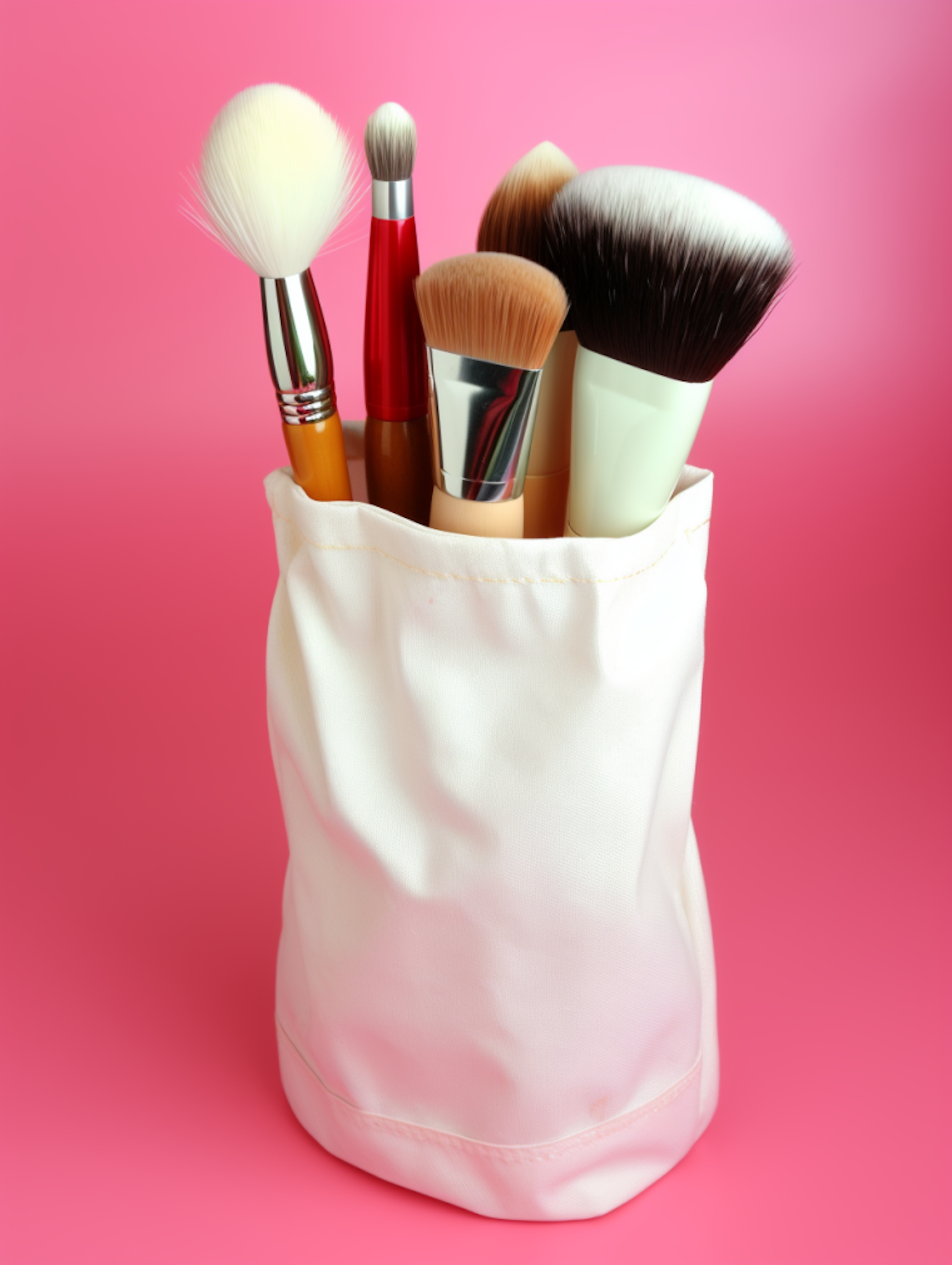 Elegant makeup brushes in a white holder against a vibrant pink background, showcasing beauty and organization.