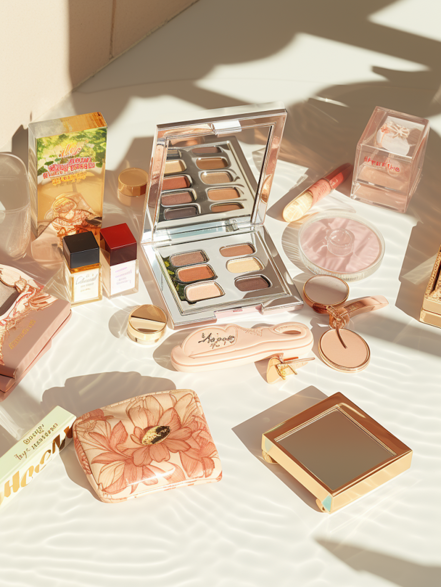 Elegant makeup collection with eyeshadow palette, floral compact, and perfume, bathed in warm sunlight on a white surface.