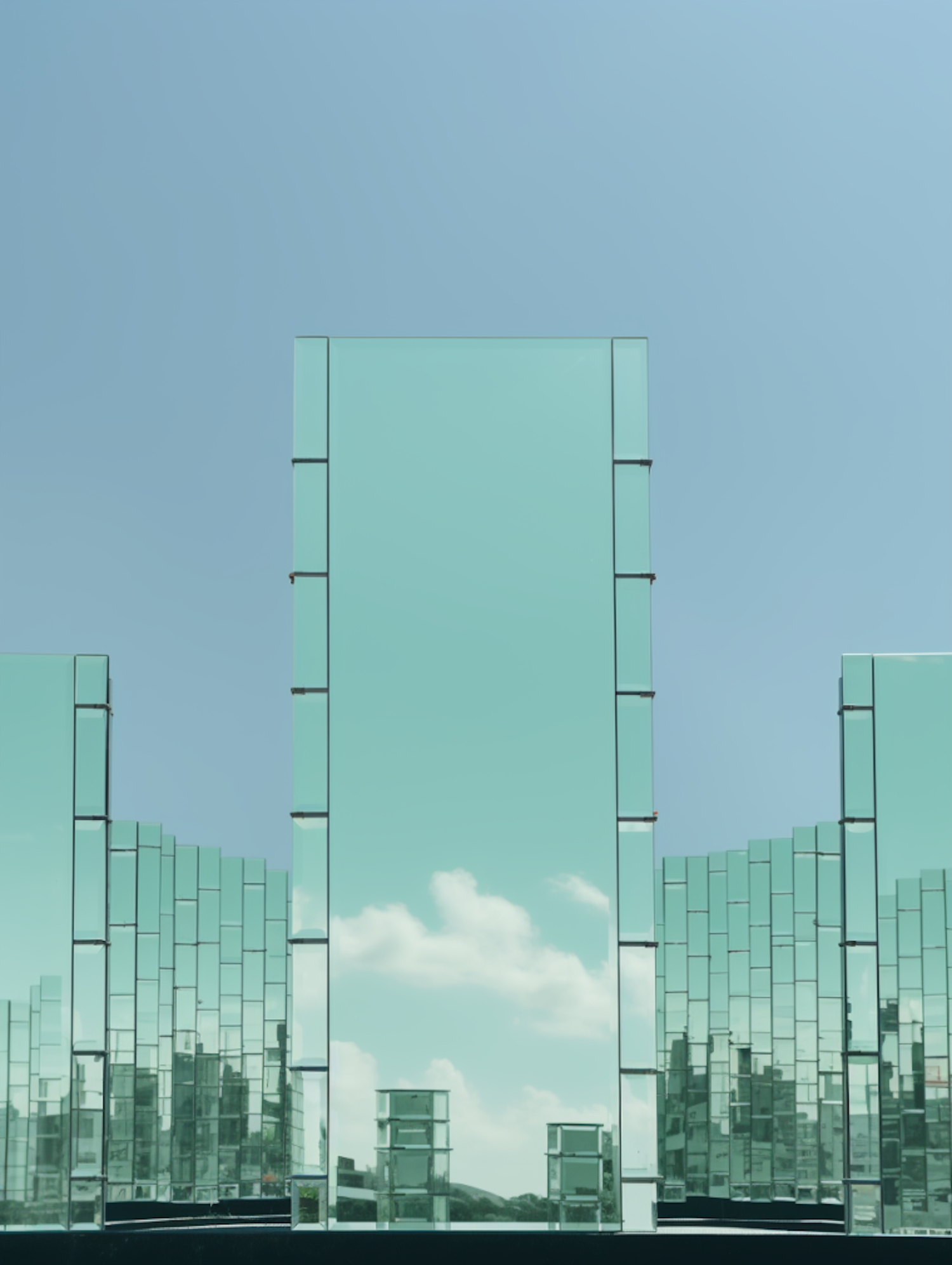 Modern glass buildings reflecting a clear sky and clouds, showcasing sleek architecture and symmetry.