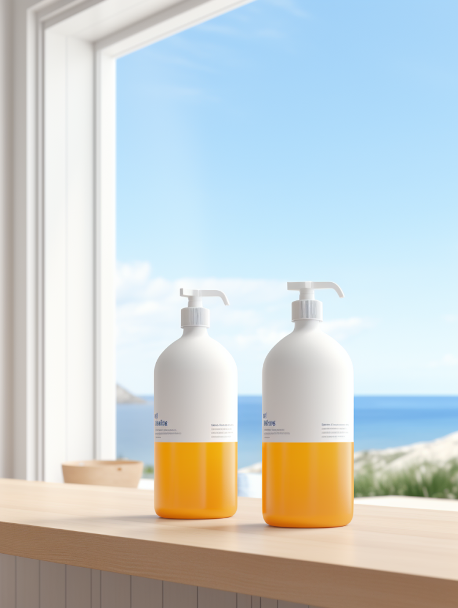 Two sleek pump bottles with orange liquid on a wooden counter, set against a serene ocean view through a large window.