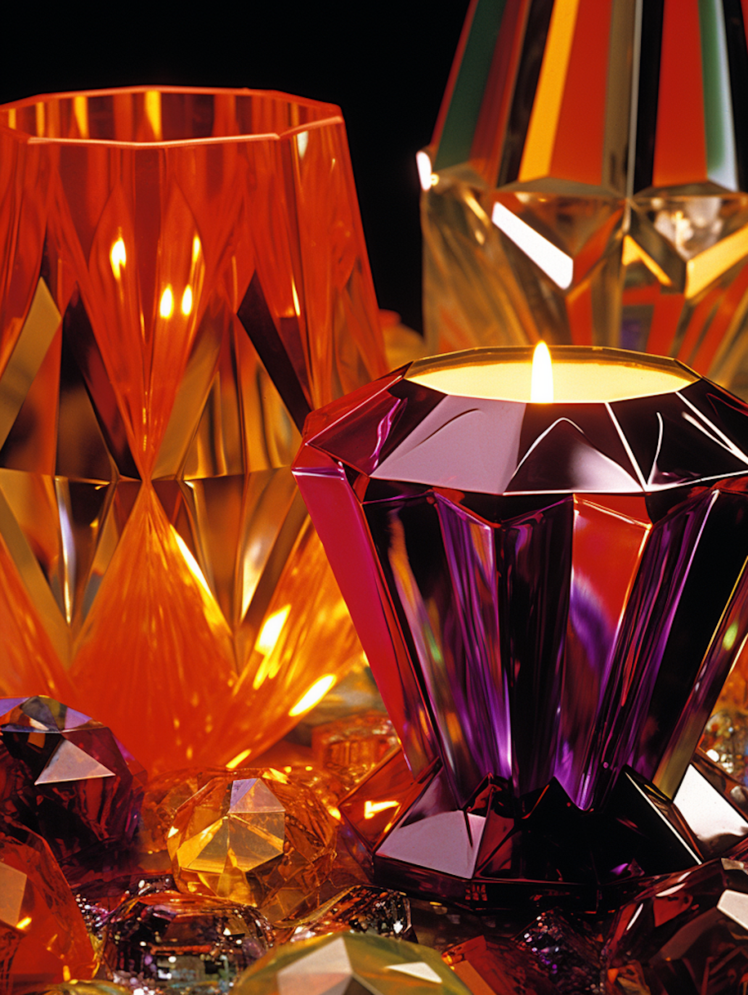 Luxurious candle holders and crystals in vibrant orange, purple, and gold hues, creating an elegant and opulent atmosphere.