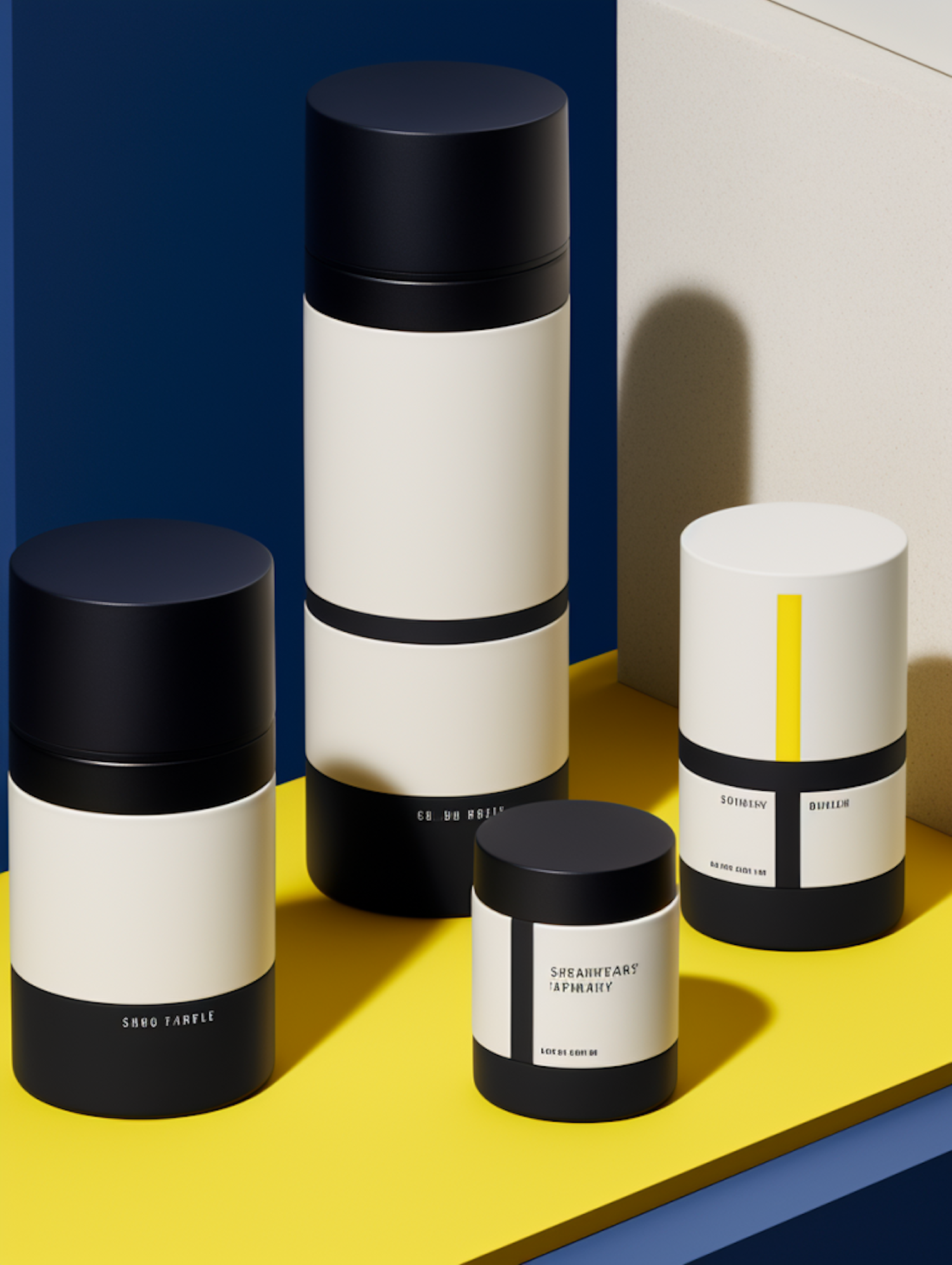 Minimalist cylindrical containers on a yellow surface with a blue background, featuring black and white design with a pop of yellow.