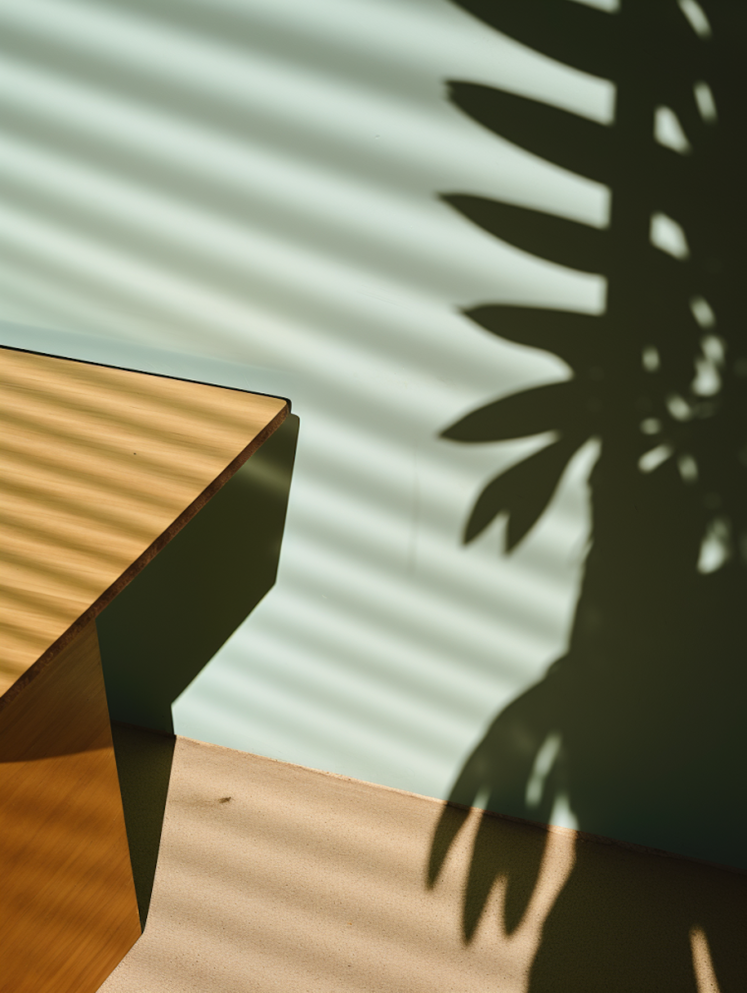Minimalist scene with wooden table, light green wall, and plant shadow. Sunlight through blinds creates artistic light patterns.