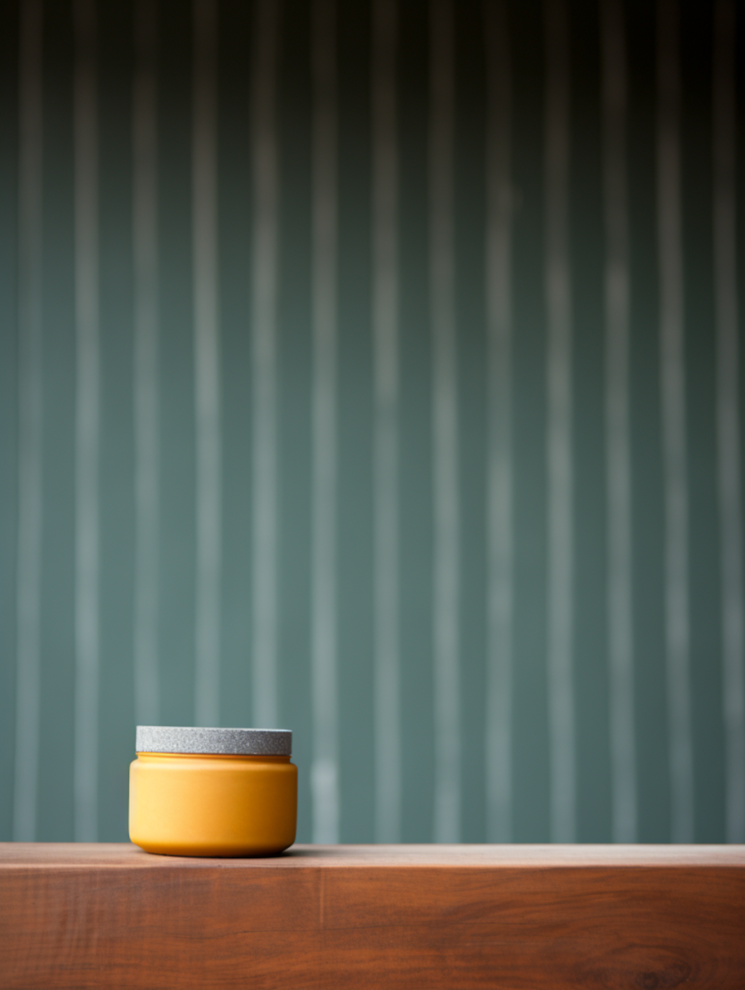 Minimalist mustard-yellow jar with gray lid on wooden surface against striped green background.