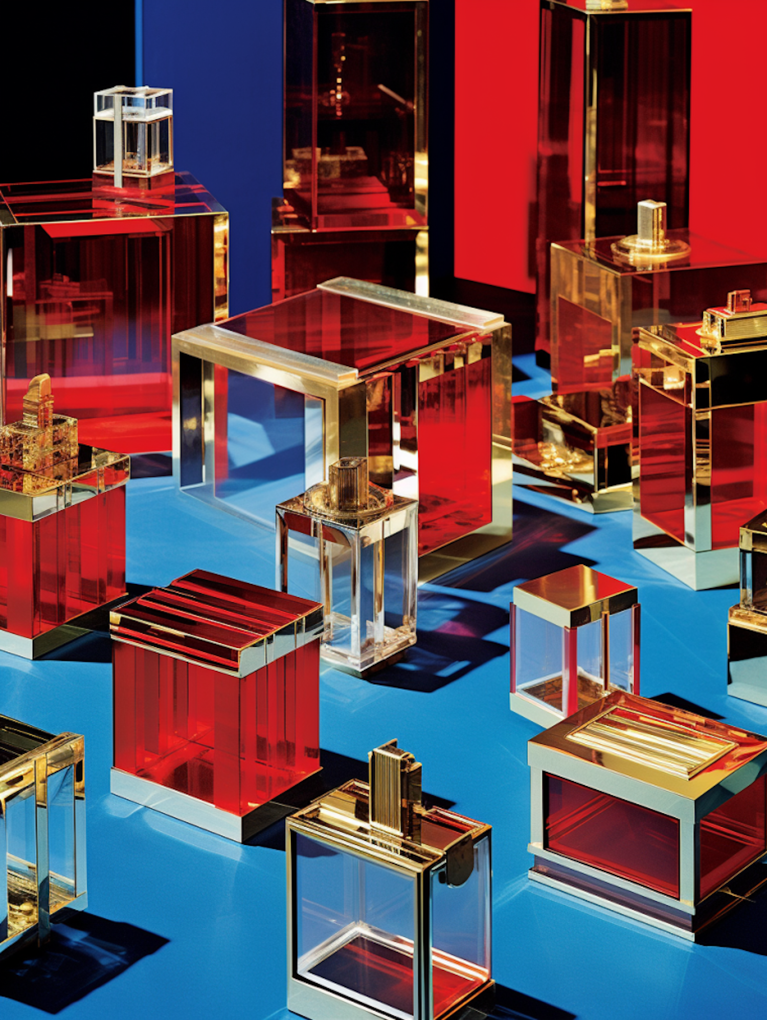 Elegant geometric perfume bottles with red and gold accents on a blue surface, creating a modern and luxurious aesthetic.