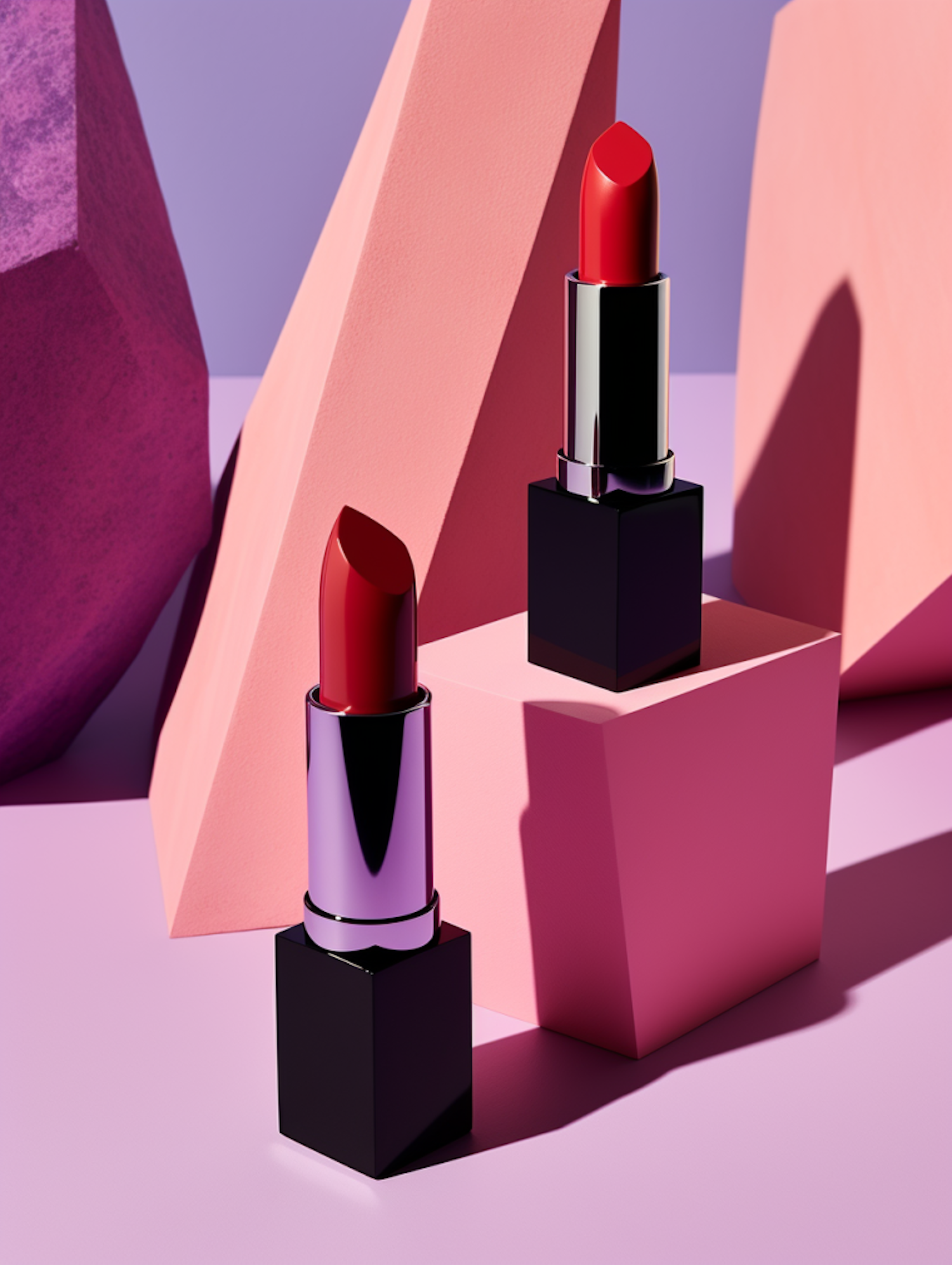 Two red lipsticks in sleek black tubes against a pastel geometric background, creating a modern and stylish visual appeal.