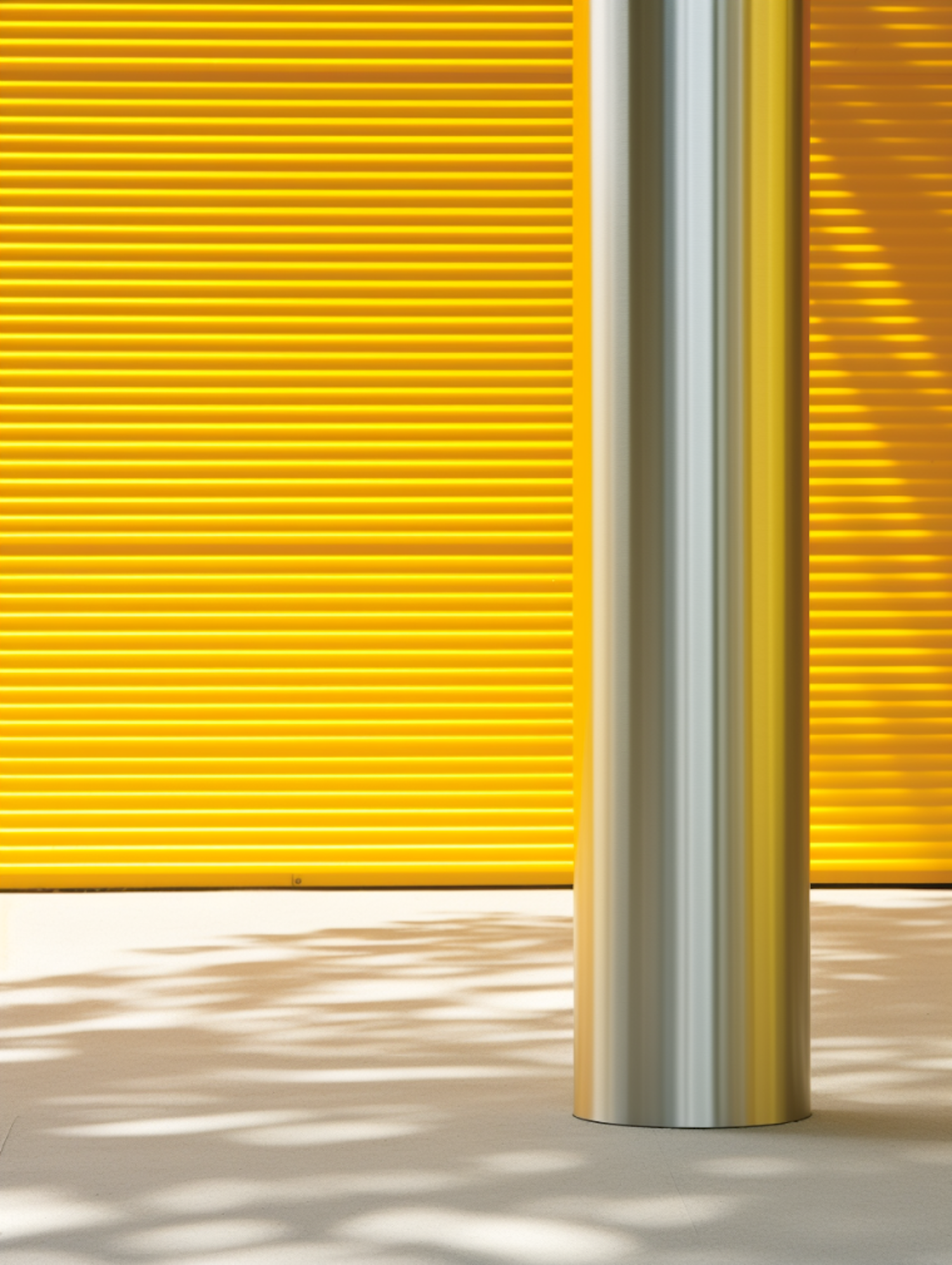 Minimalist scene with a yellow corrugated wall, metallic column, and dappled shadows on a smooth surface. Modern and vibrant design.
