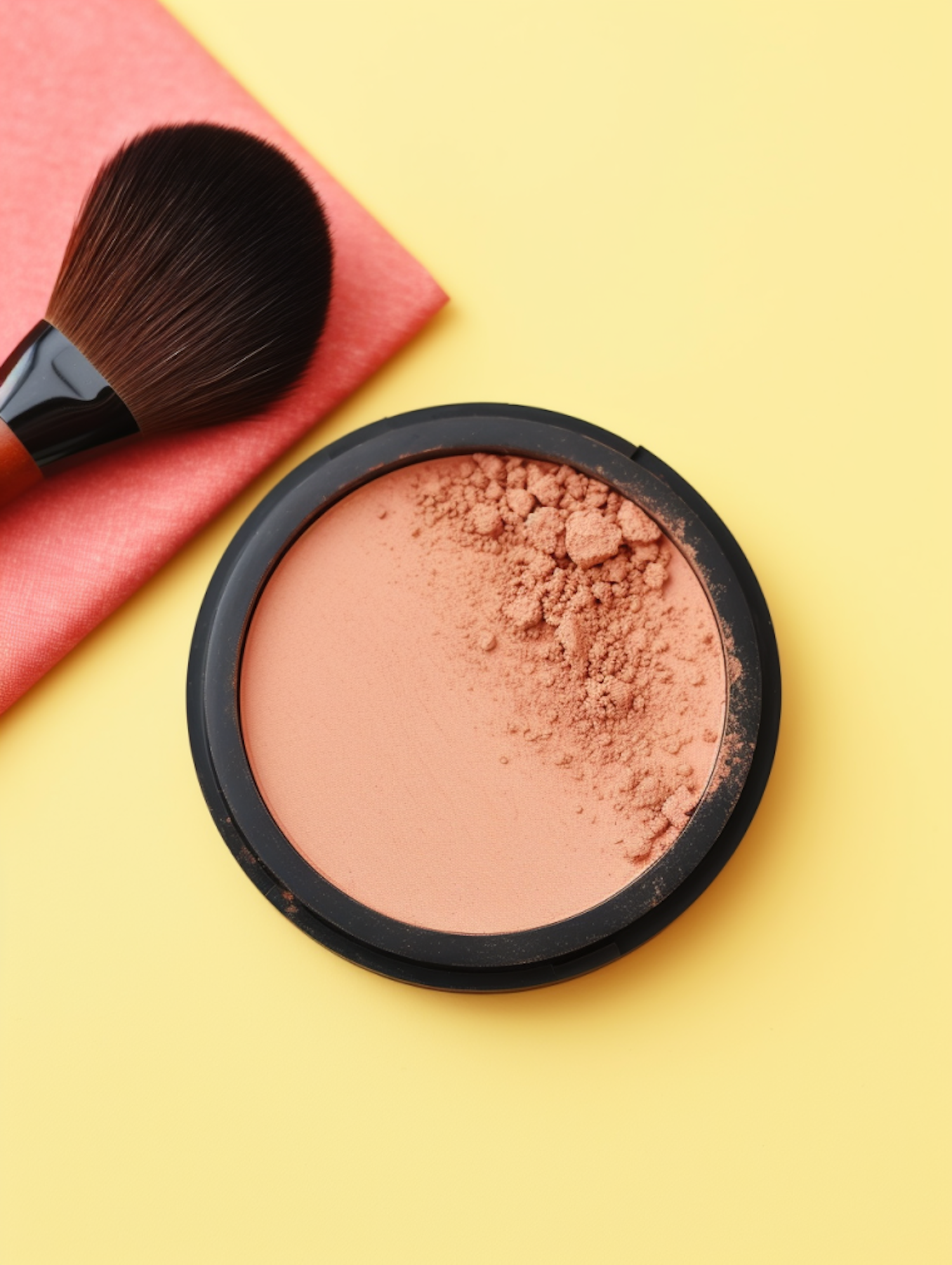 Peach blush compact with loose powder and makeup brush on a vibrant yellow background.