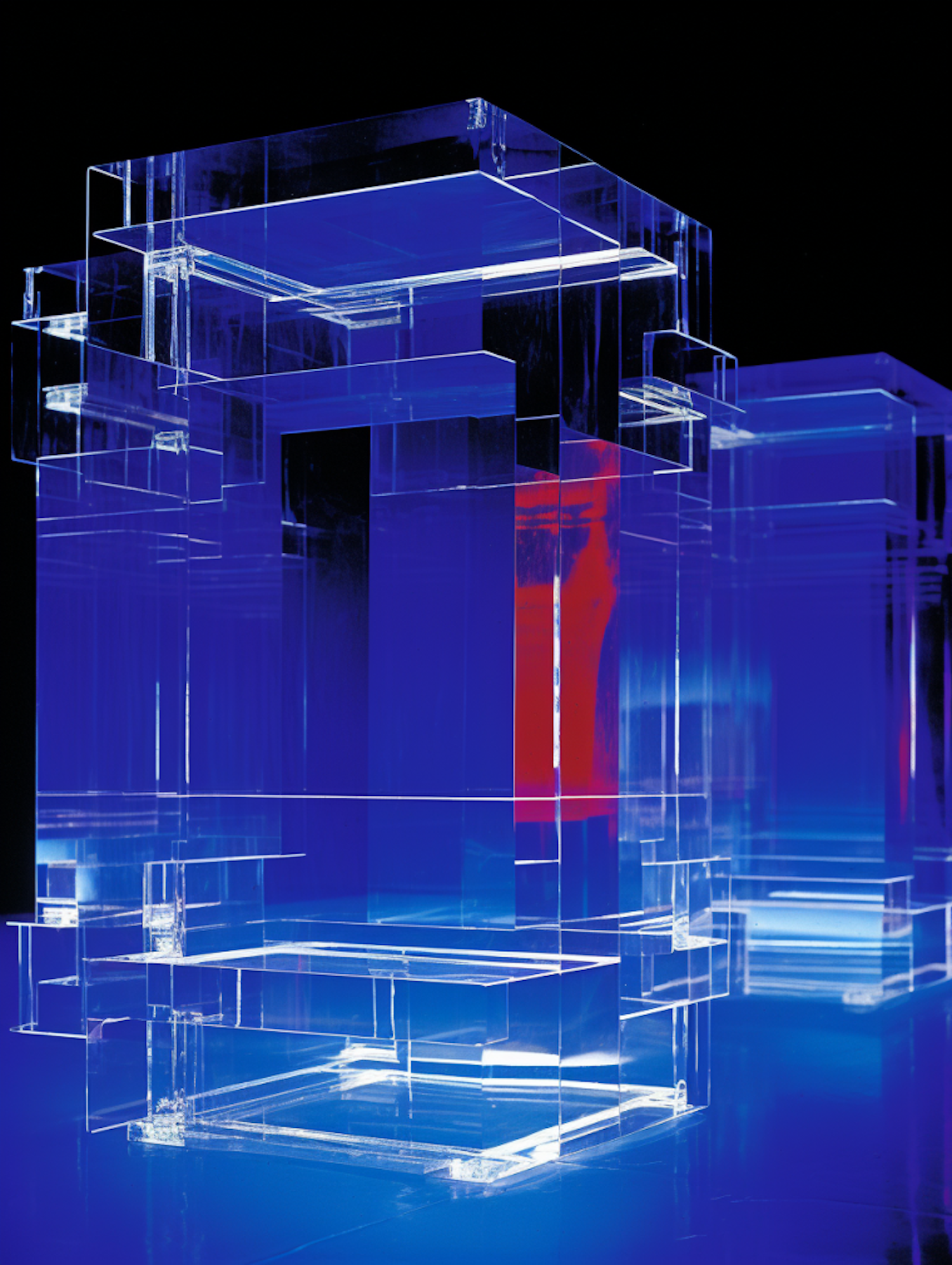 Abstract transparent geometric structures with glowing blue light and a red accent, creating a futuristic and modern aesthetic.