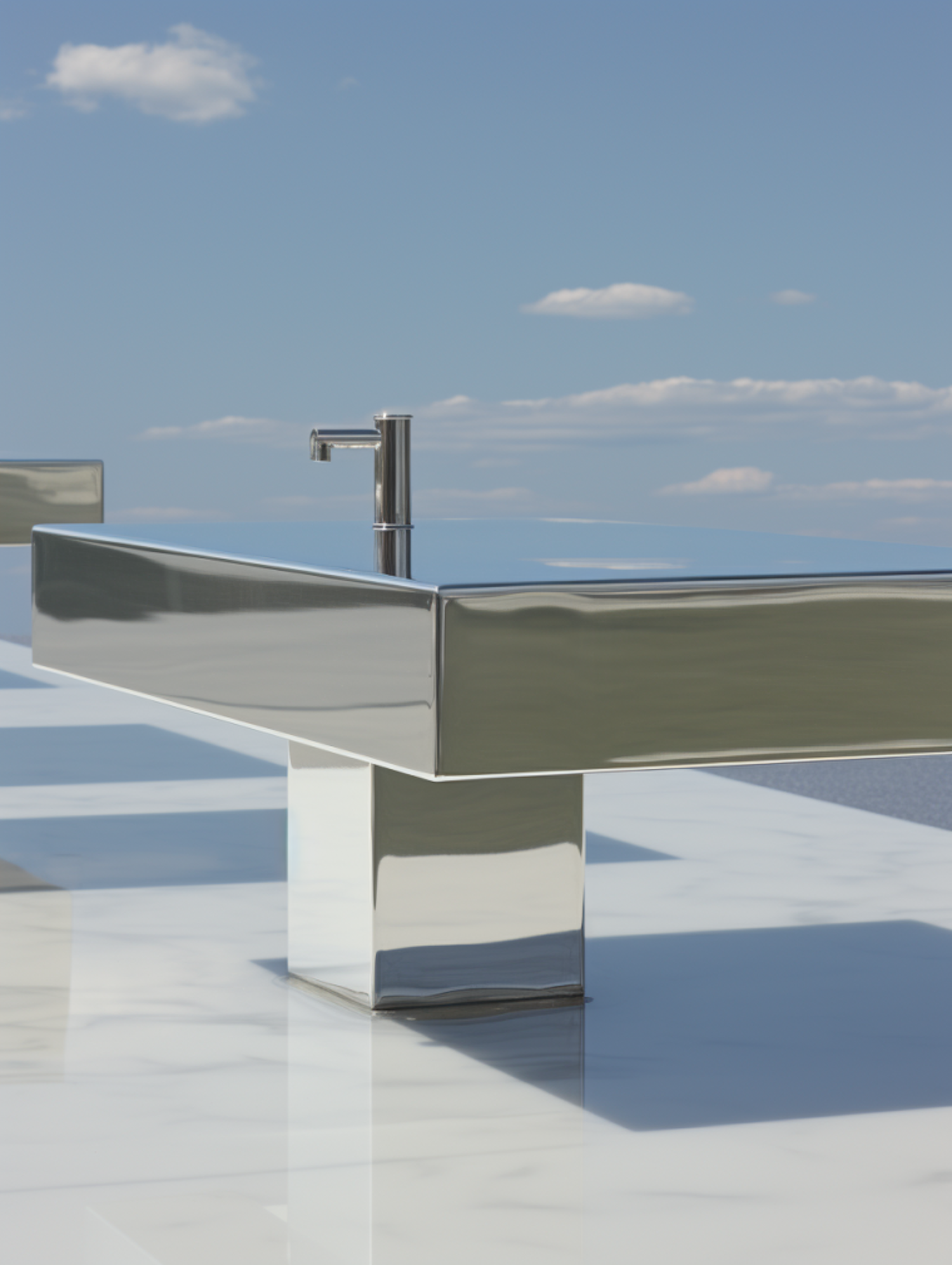 Sleek outdoor sink with polished metal finish against a clear blue sky, featuring minimalist design and reflective surfaces.