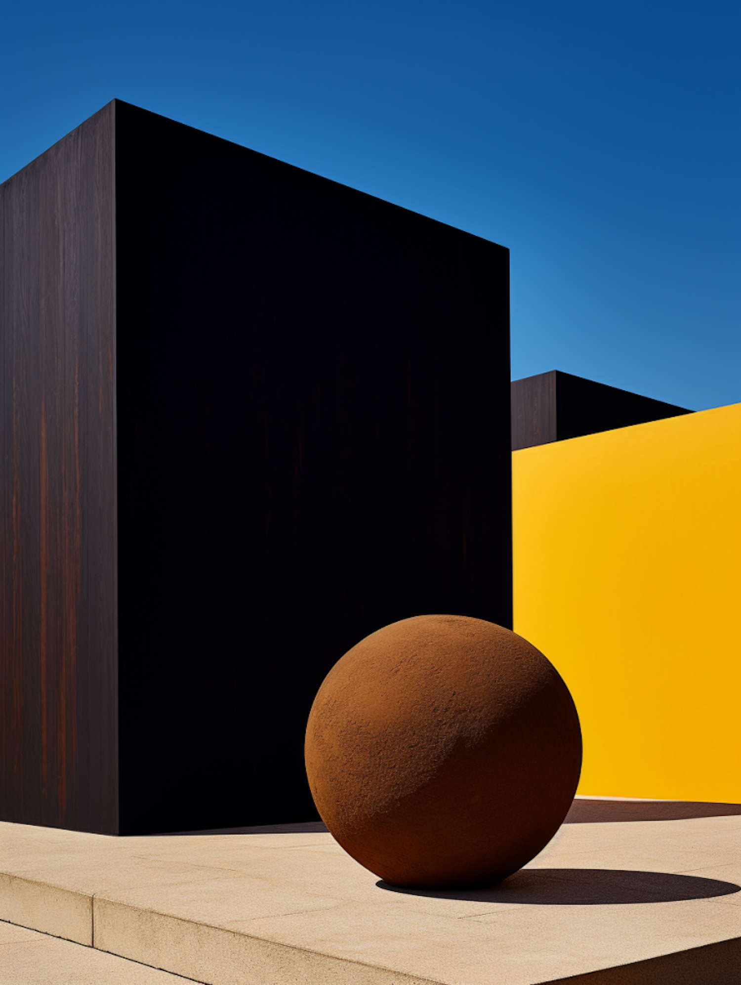 Minimalist architecture with a dark cube, yellow wall, and rust sphere under a clear blue sky. Bold geometric contrasts.