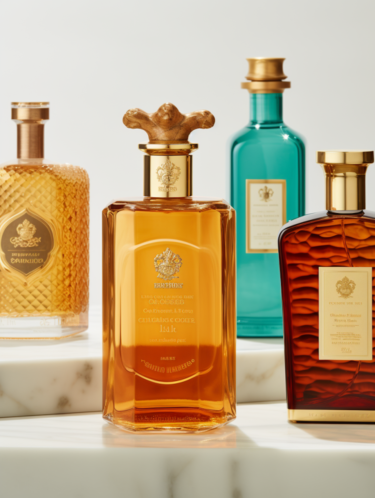 Luxurious perfume bottles on marble, featuring ornate designs and rich colors, exuding elegance and sophistication.