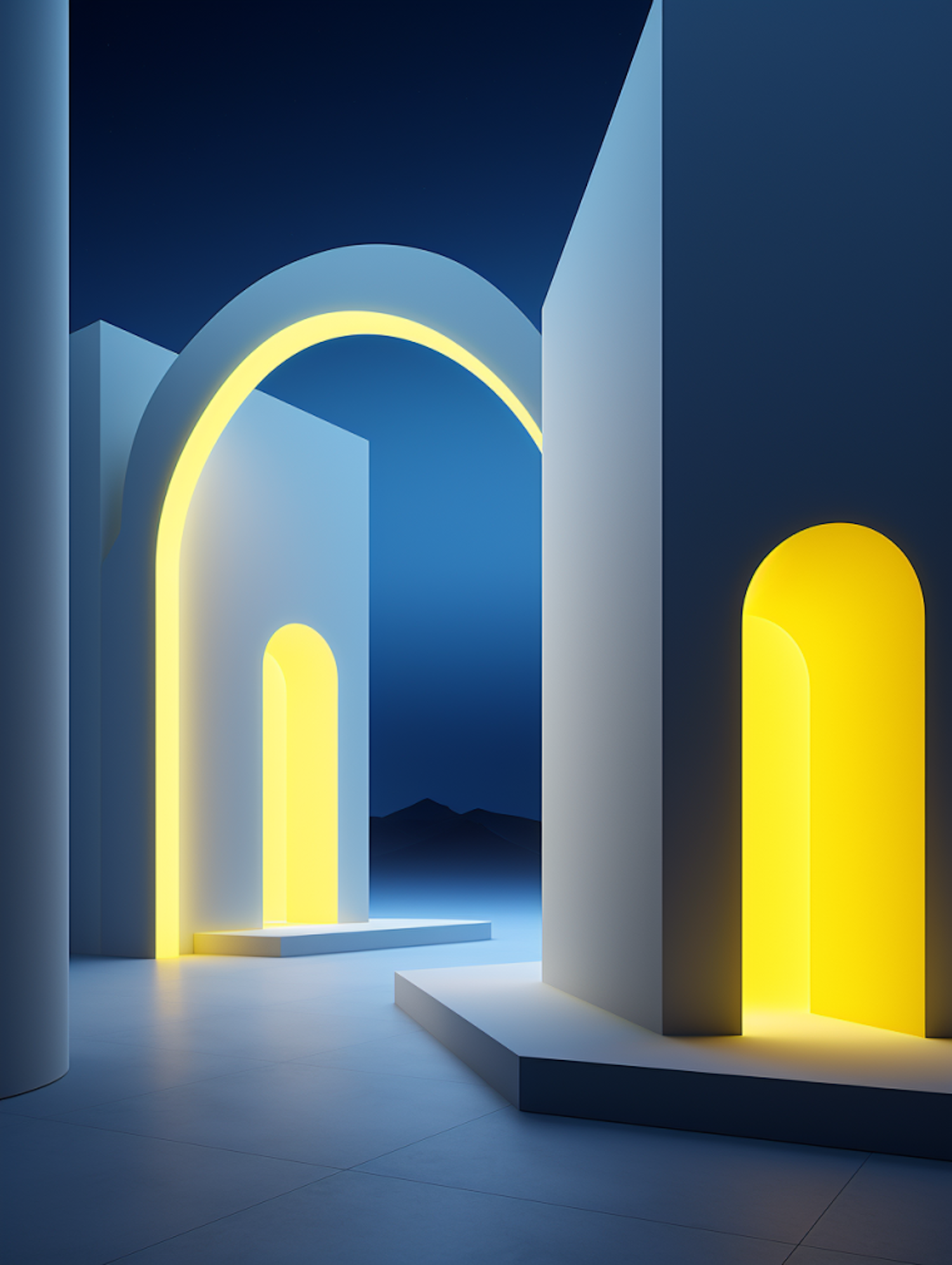 Surreal architectural scene with glowing arches and geometric structures against a deep blue sky, creating a futuristic ambiance.