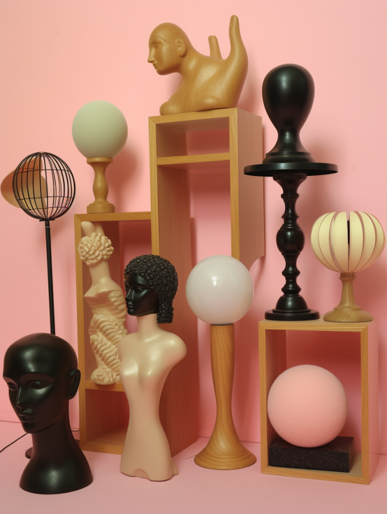 Artistic display of mannequin heads and spherical objects against a pink backdrop, featuring diverse textures and shapes.