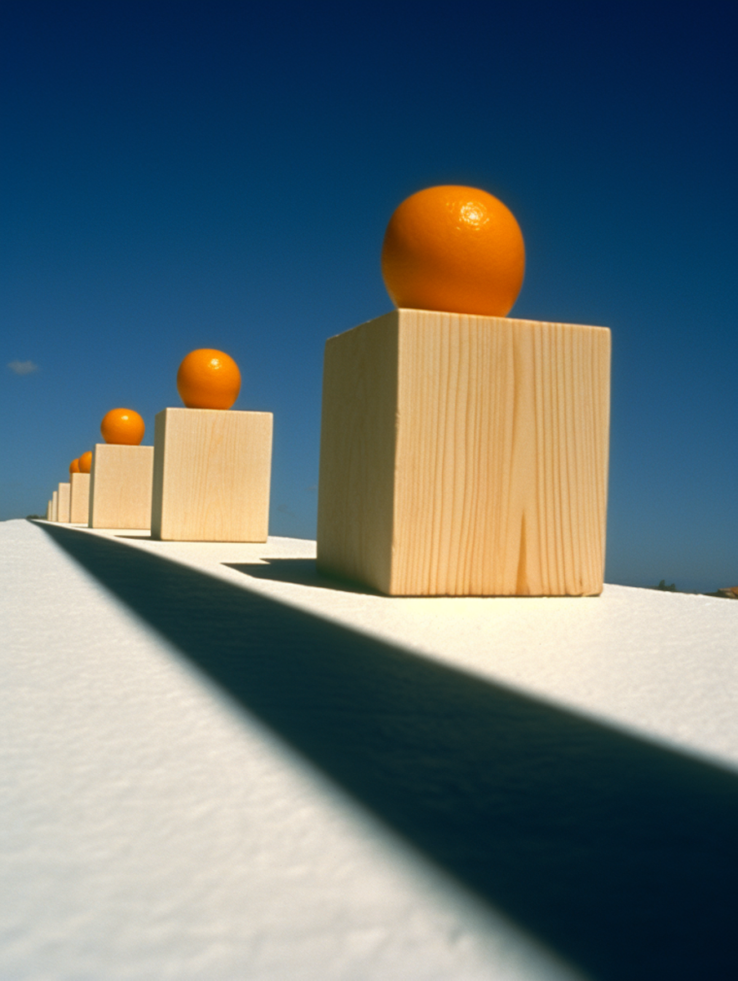 Wooden blocks topped with orange spheres aligned on a white surface against a deep blue sky, casting long shadows.