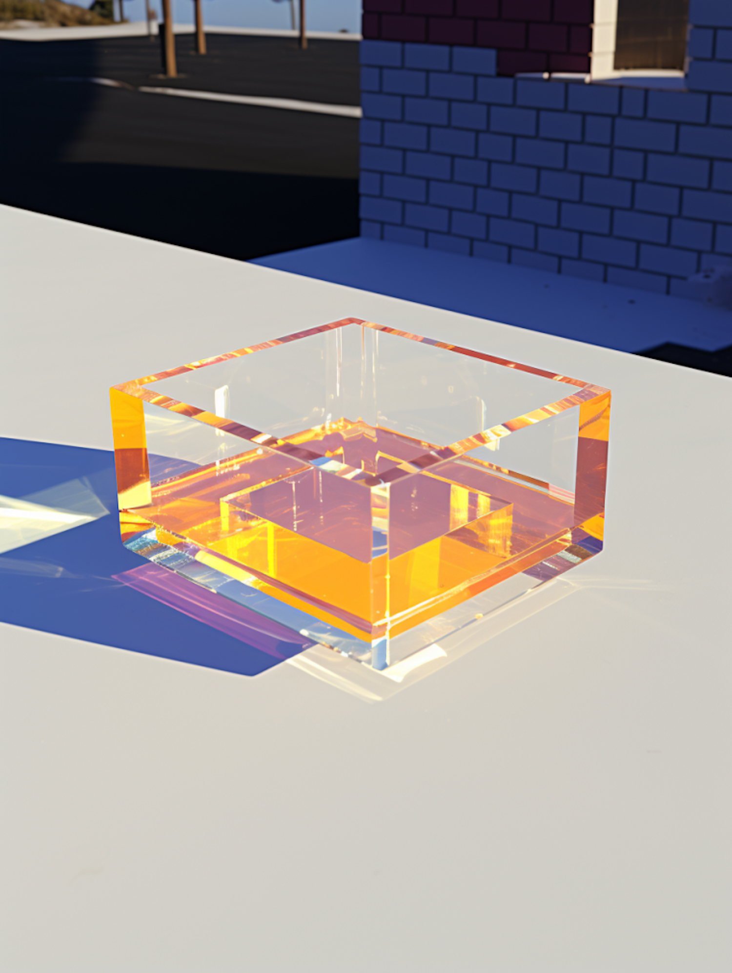 A transparent orange acrylic cube on a white surface, casting colorful reflections and shadows in sunlight.