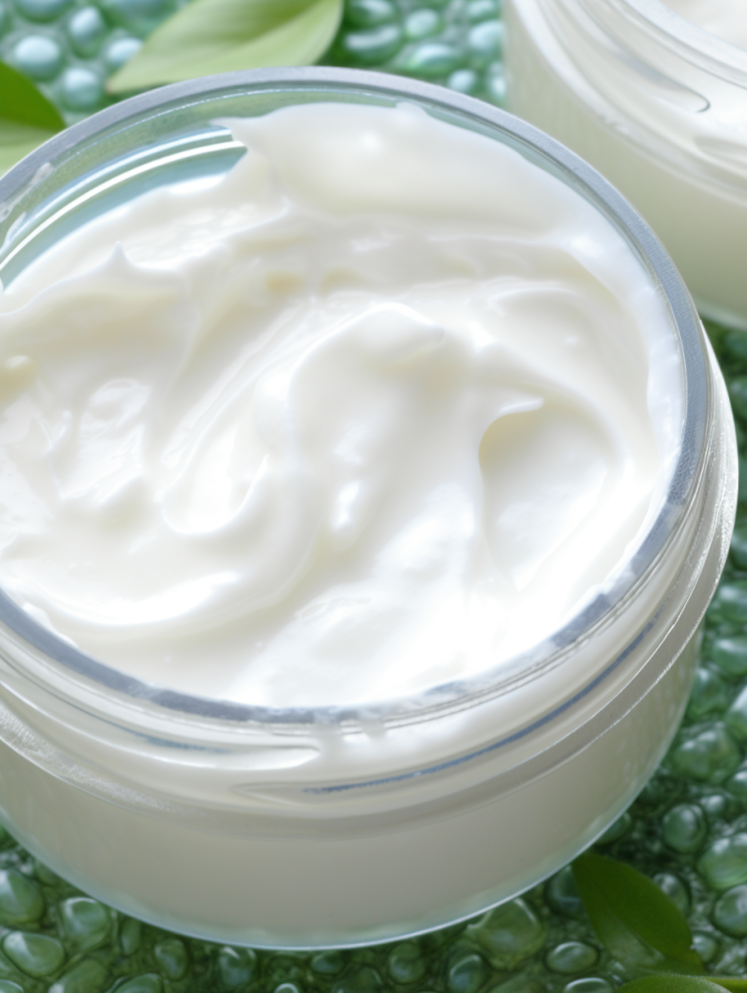 Close-up of a jar filled with creamy white lotion, surrounded by green leaves and glass pebbles, creating a fresh, natural look.