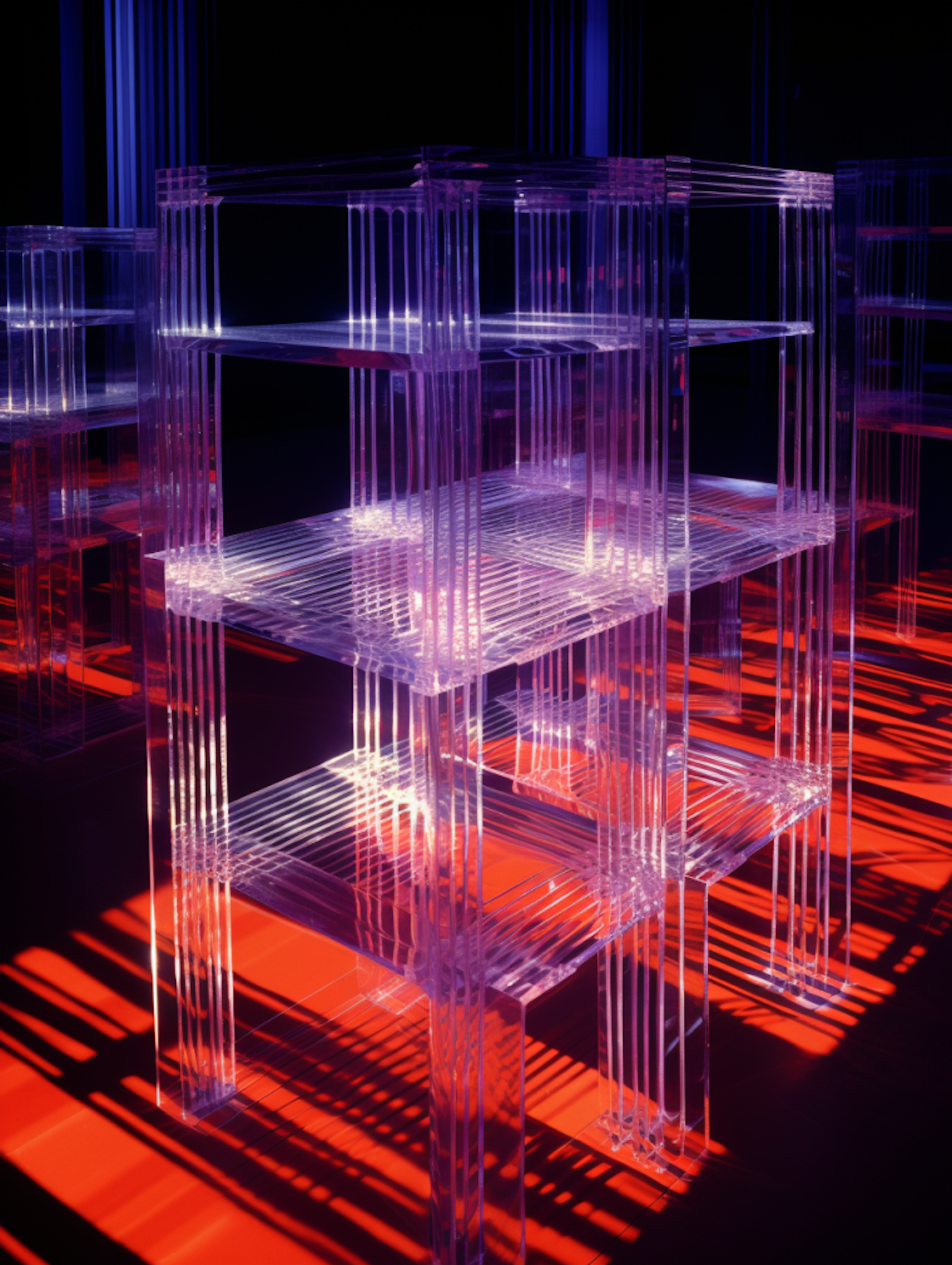 Transparent acrylic shelves illuminated by red and blue lights, creating dramatic shadows and a modern, futuristic aesthetic.