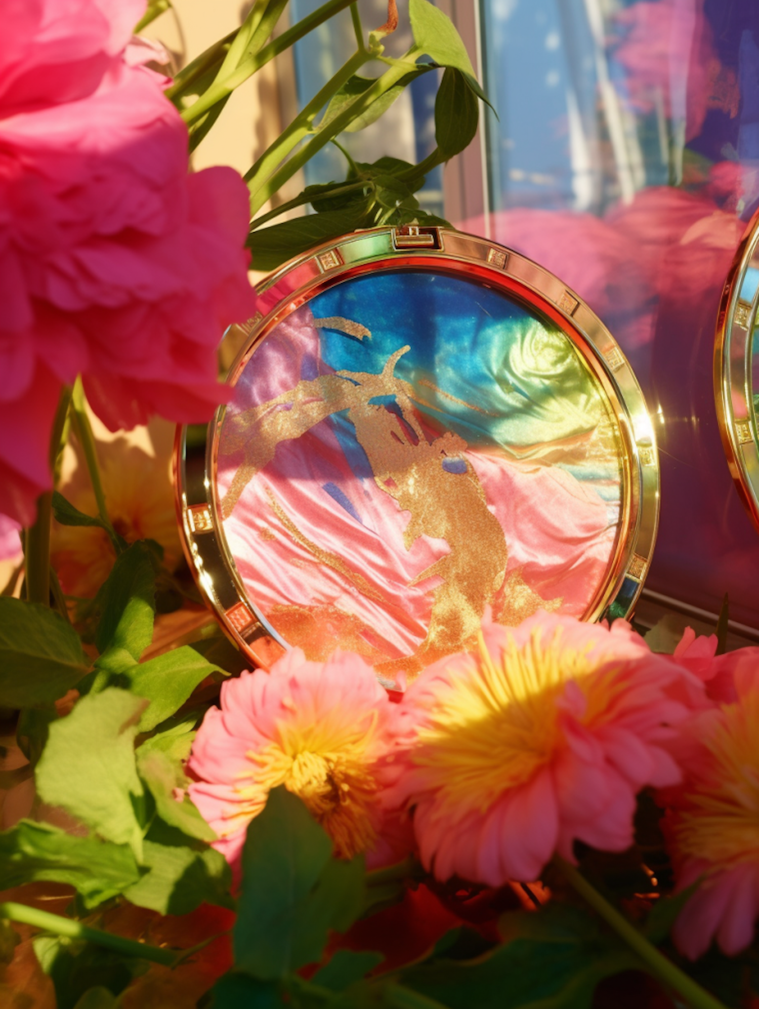 Colorful compact mirror with gold accents surrounded by vibrant pink and yellow flowers, creating a luxurious and artistic scene.