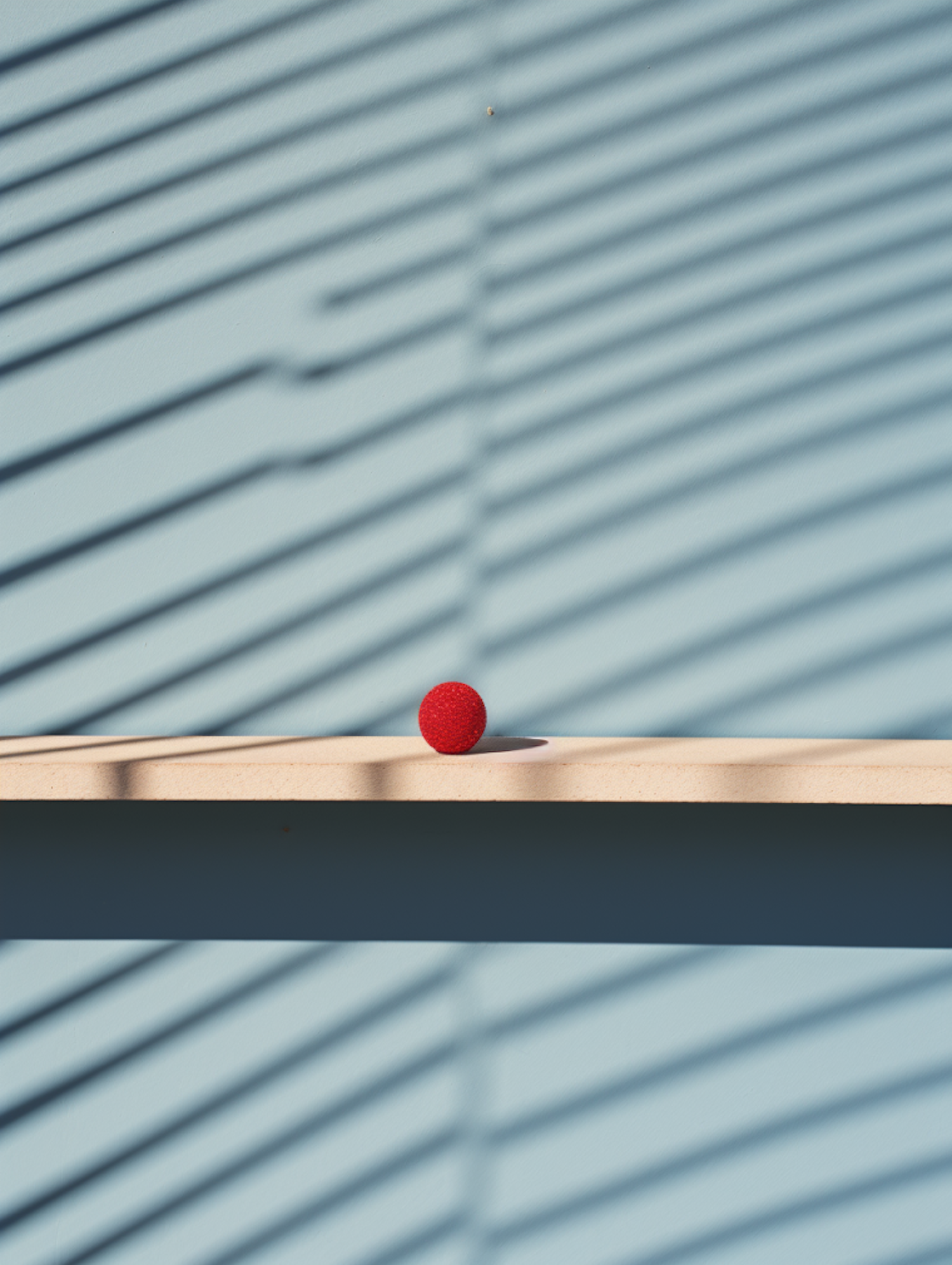 Minimalist scene with a red ball on a wooden shelf, blue background, and diagonal shadow lines. Simple and striking composition.