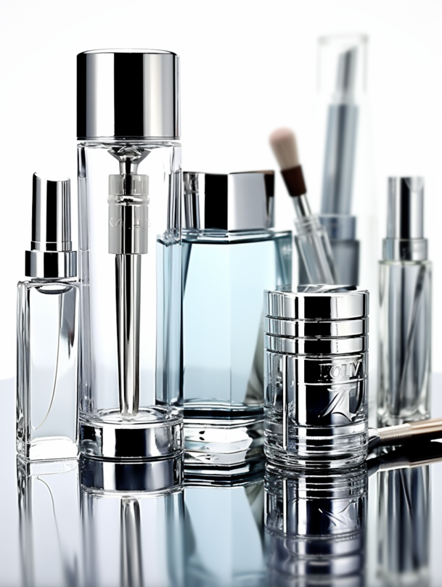 Elegant glass cosmetic bottles with silver caps on a reflective surface, featuring light blue liquid and a makeup brush.
