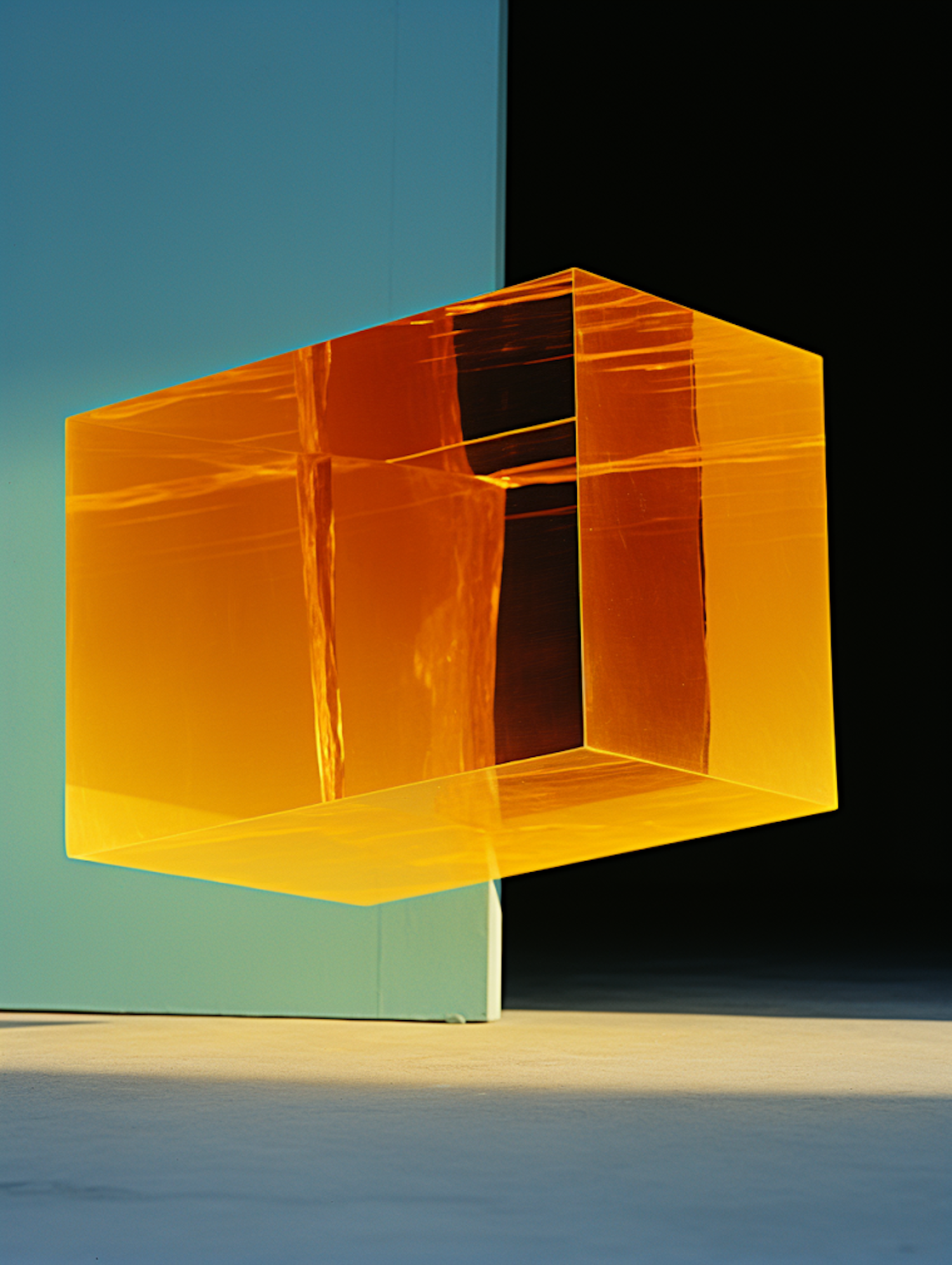 A translucent orange cube floats against a contrasting blue and black background, creating a striking visual effect.