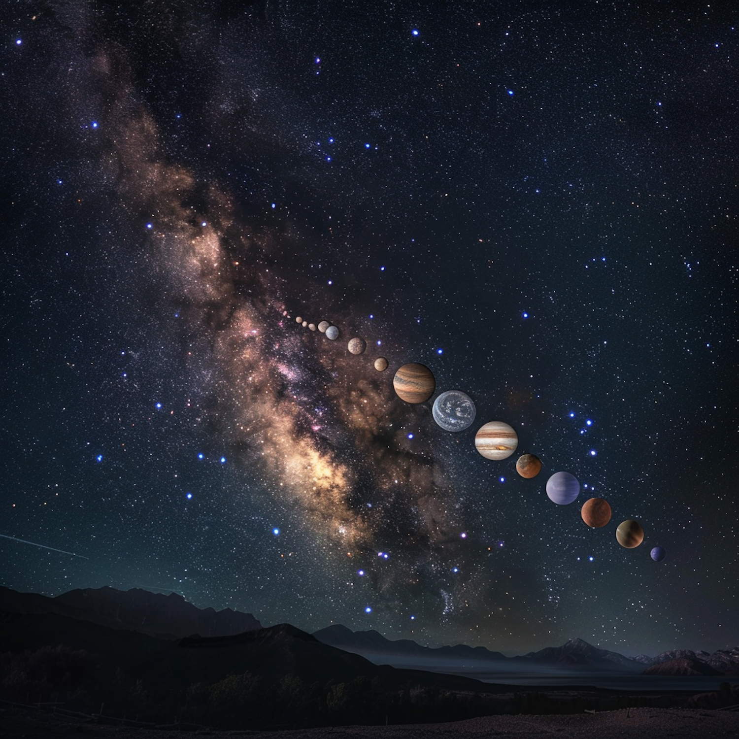 A surreal night sky with the Milky Way and aligned planets, creating a stunning cosmic display over silhouetted mountains.