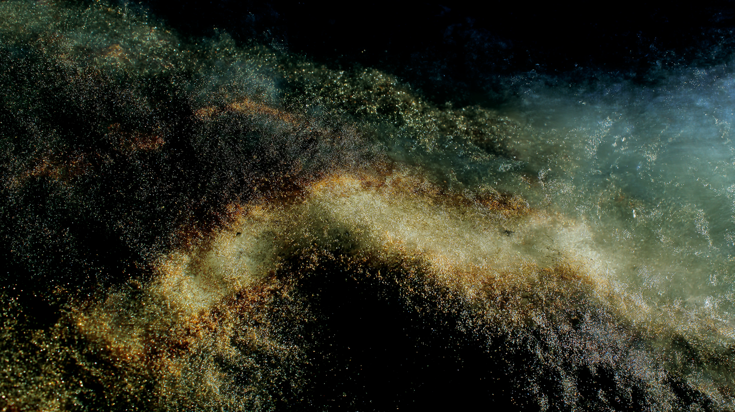 A stunning cosmic-like scene with swirling dark and light areas, resembling a nebula with shimmering gold and white particles.