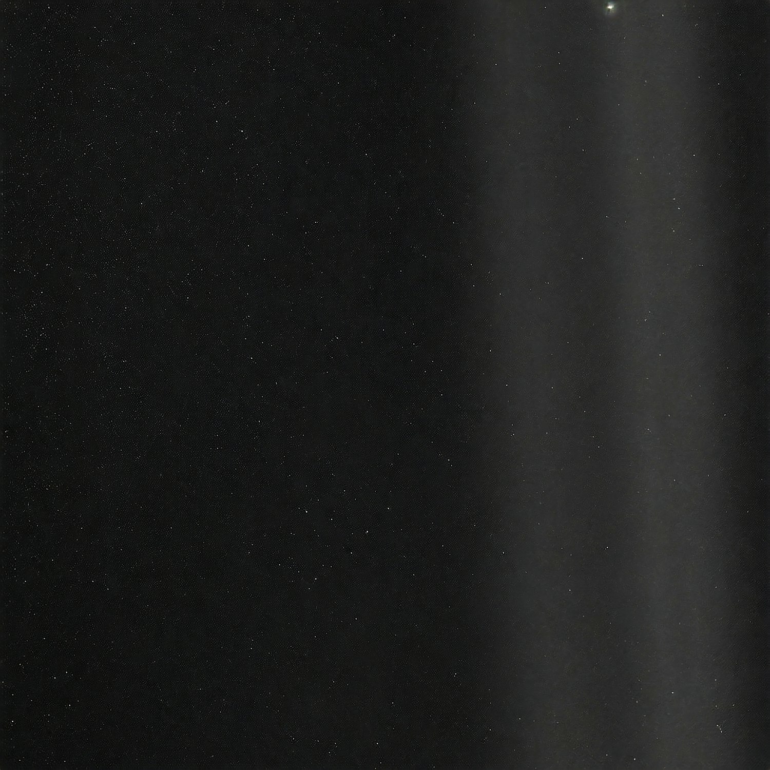 A tiny pale blue dot in the vastness of space, surrounded by a faint light beam against a dark, star-speckled background.