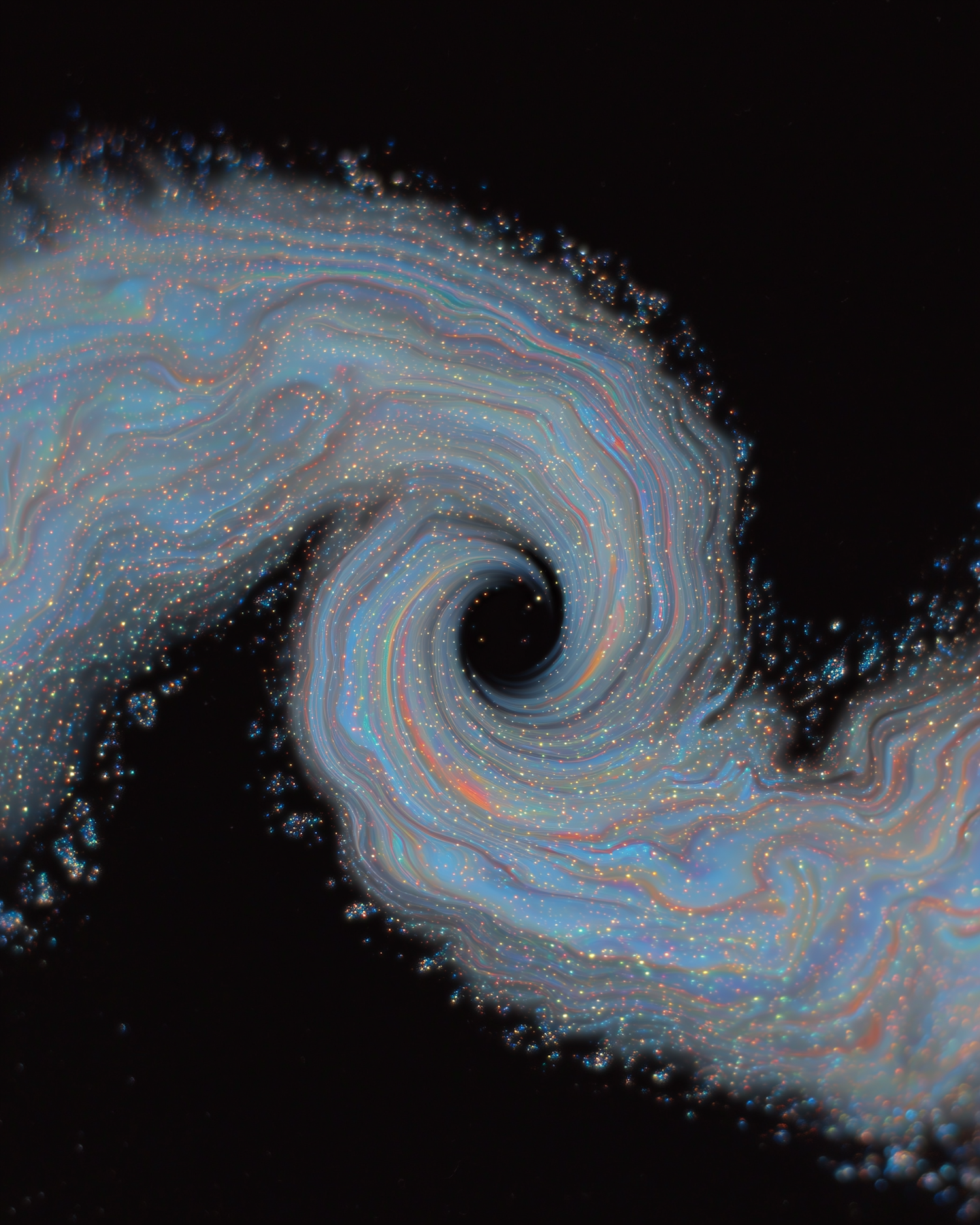 A vibrant, swirling spiral pattern with iridescent hues on a black background, creating a hypnotic and otherworldly visual experience.