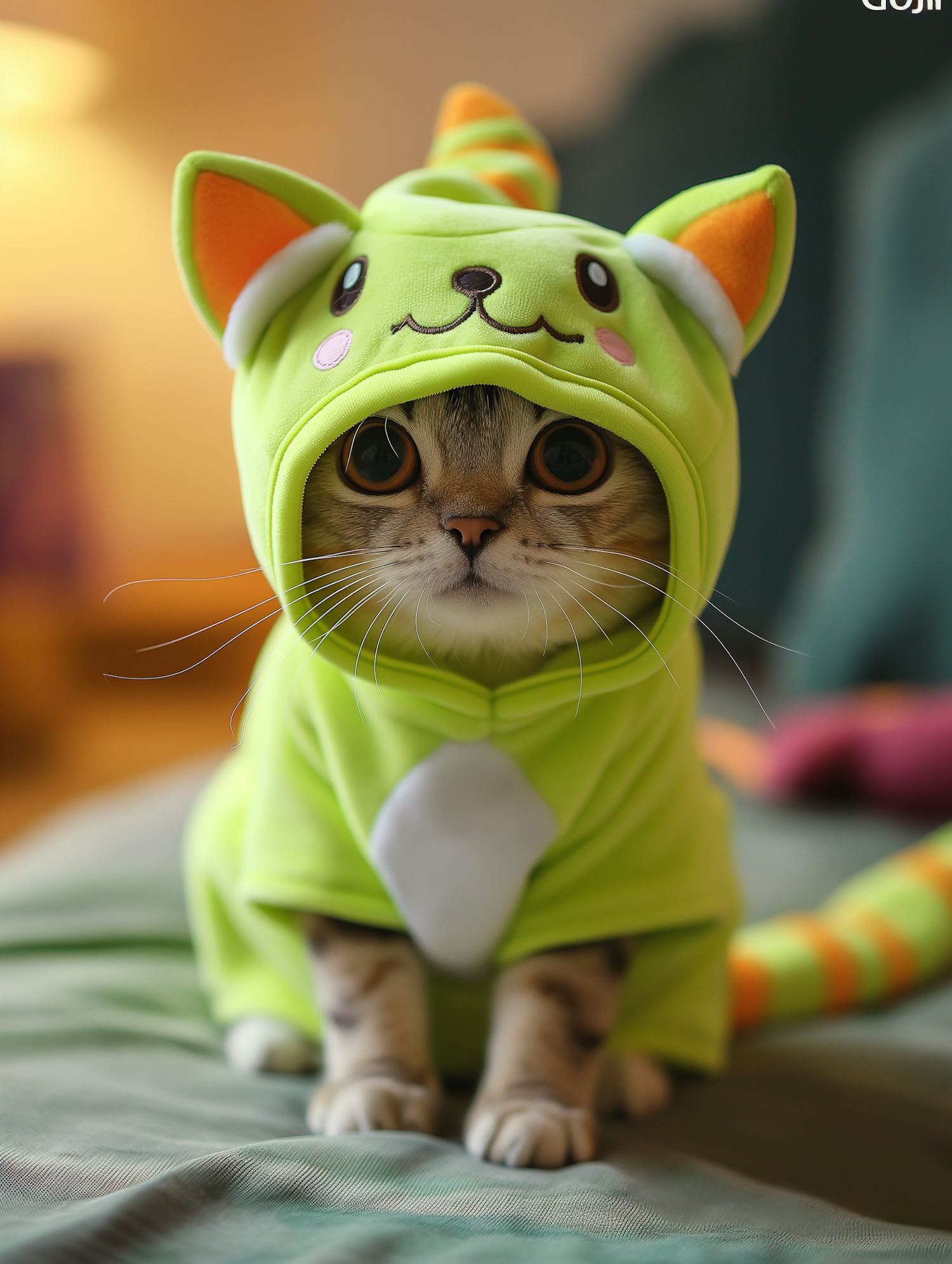 Adorable cat in a bright green cartoon costume with big eyes and orange ears, sitting on a soft surface. Perfect for pet lovers!