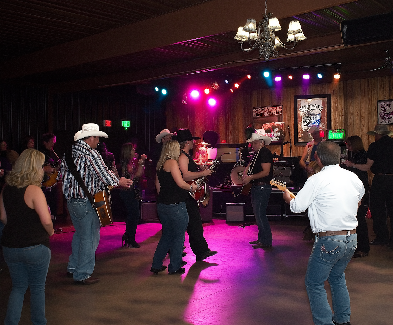Lively country music scene with people dancing and playing instruments in a rustic bar setting, illuminated by colorful lights.