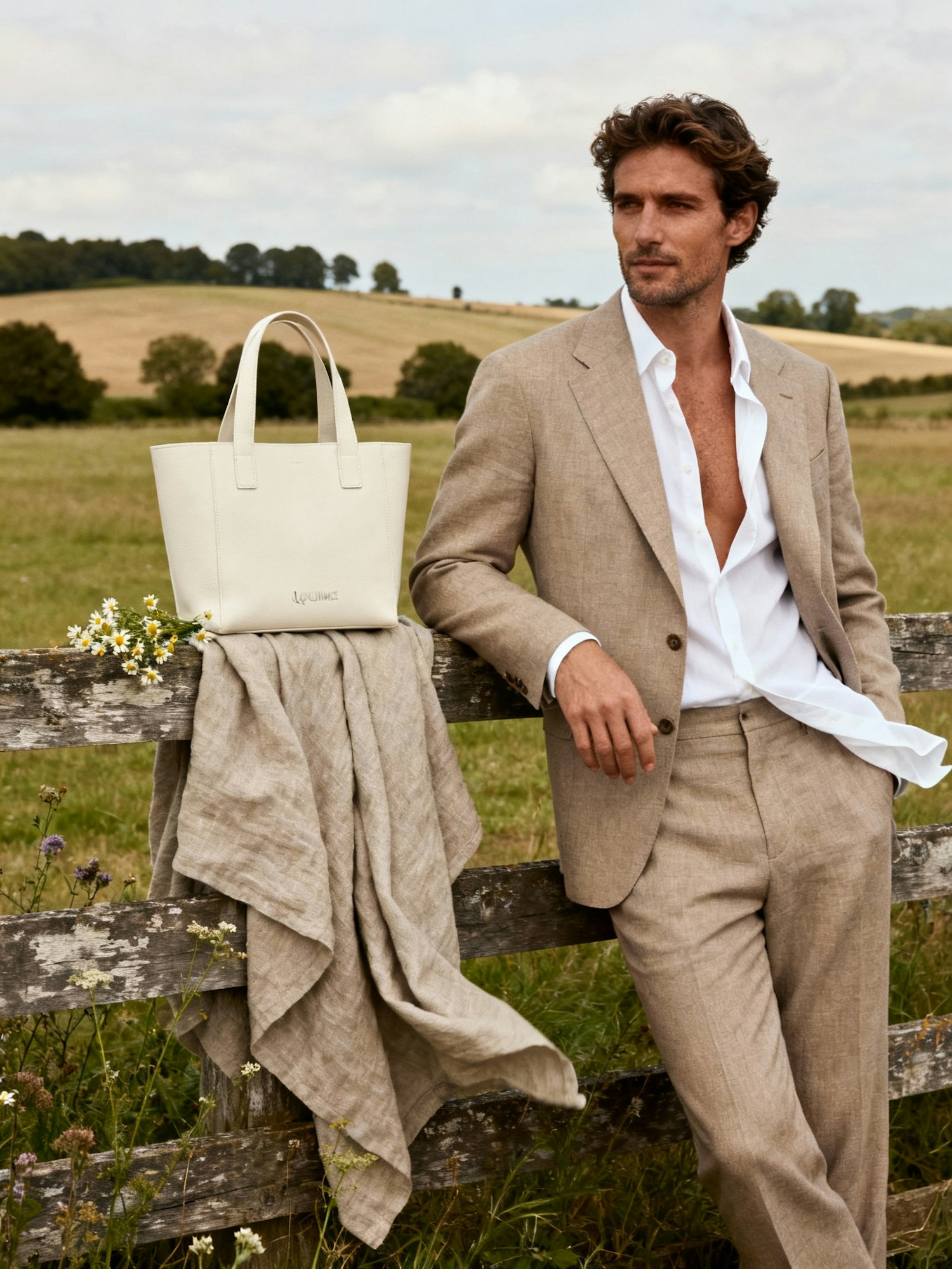 A man in a beige suit leans on a fence in a countryside setting, with a tote bag and linen cloth nearby, exuding a relaxed vibe.