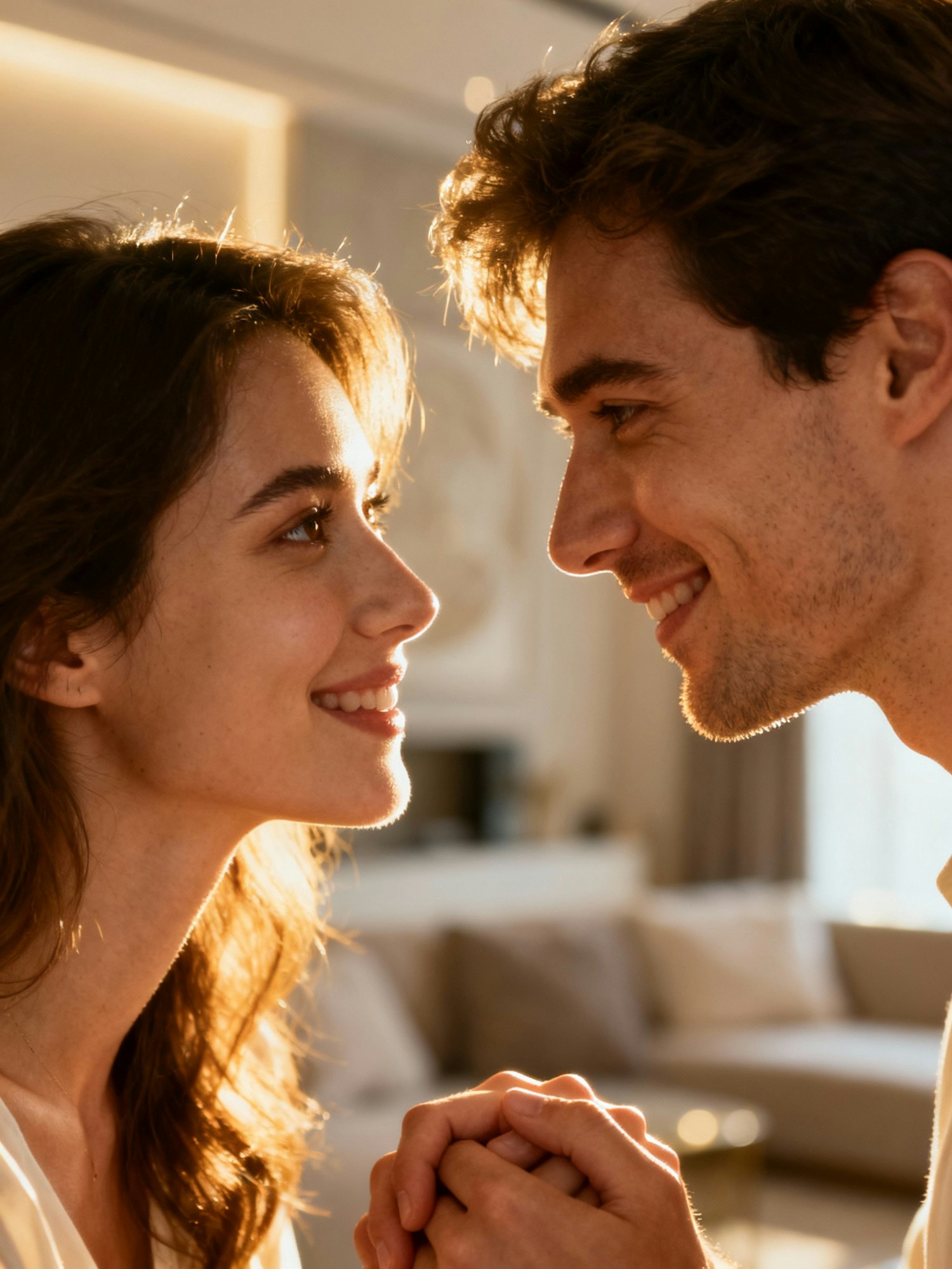 A couple sharing a warm moment, gazing into each other's eyes with smiles, in a softly lit indoor setting.