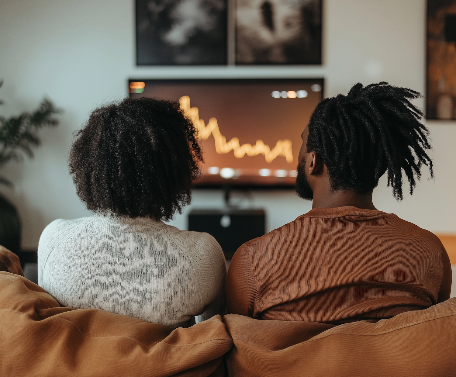Two people watch a graph on TV, seated on a cozy couch in a warmly lit room with art on the walls.