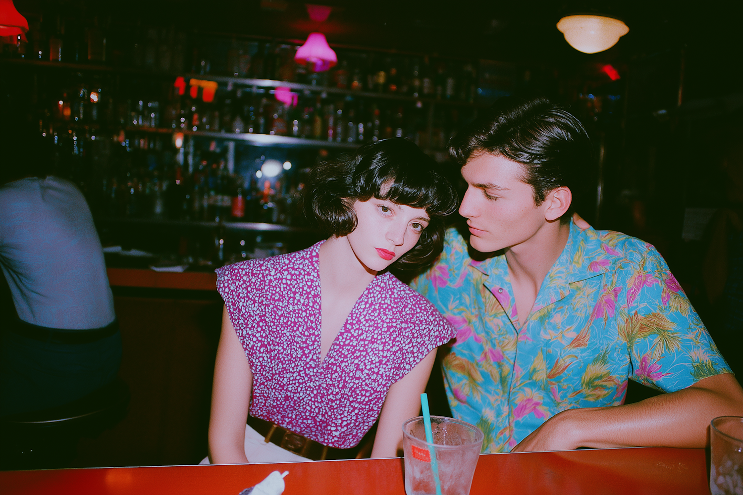 A stylish couple at a dimly lit bar, with vibrant outfits and a retro vibe, sharing a quiet moment together.
