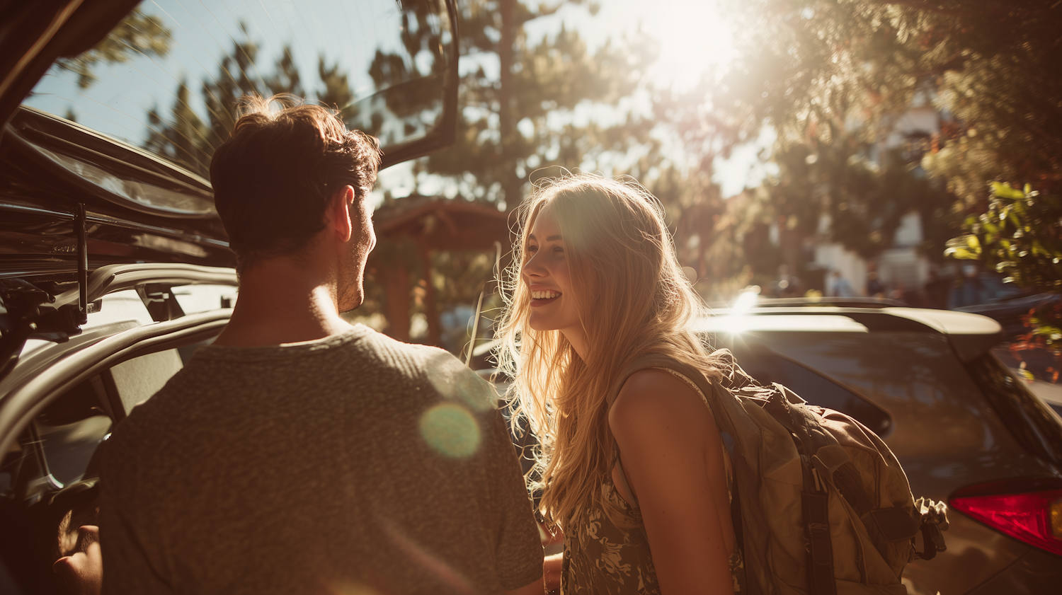 A cheerful couple enjoying a sunny day near their car, with warm sunlight and a natural outdoor setting creating a relaxed vibe.