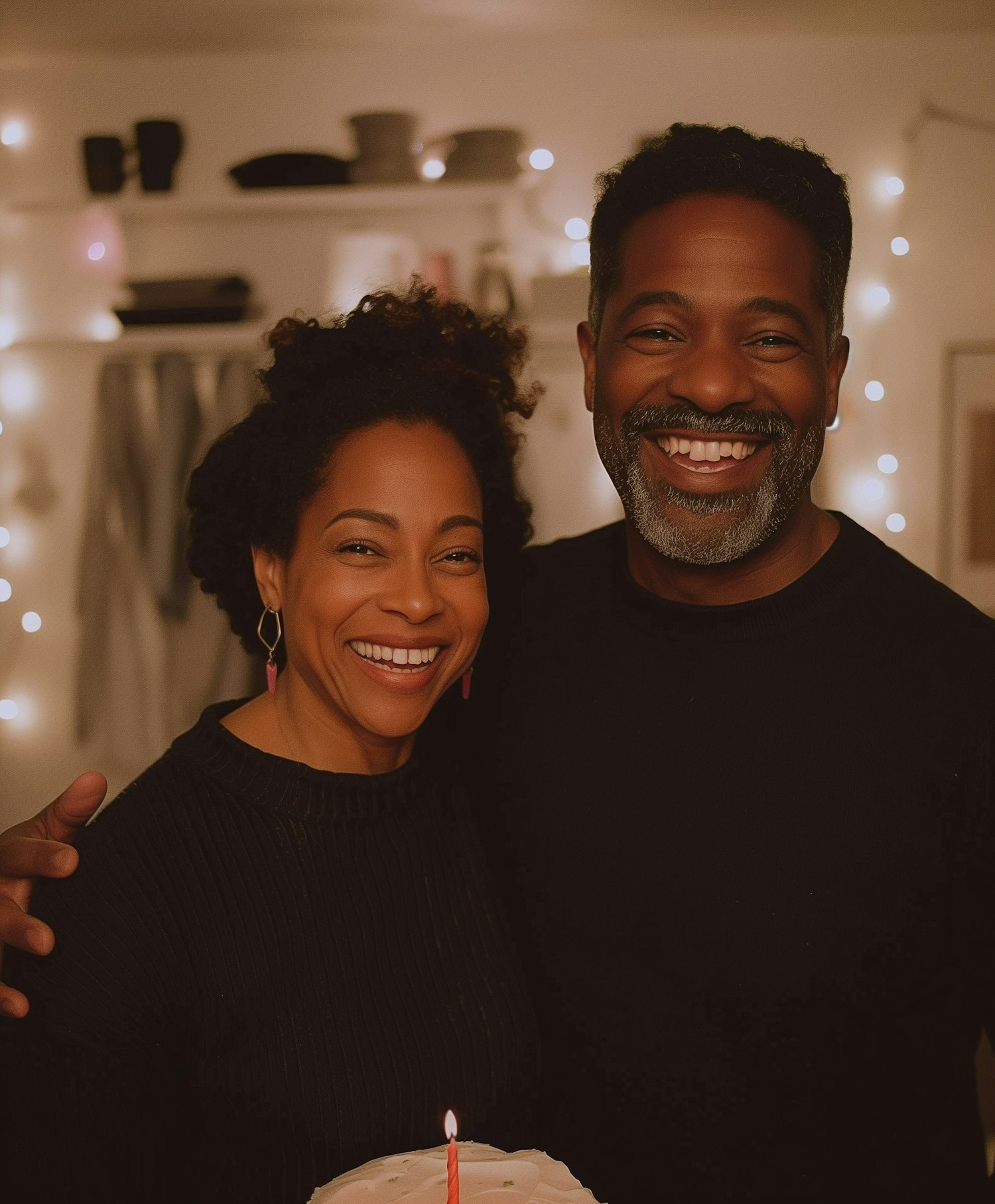 Smiling couple celebrating with a cake and candle, surrounded by warm fairy lights in a cozy setting.