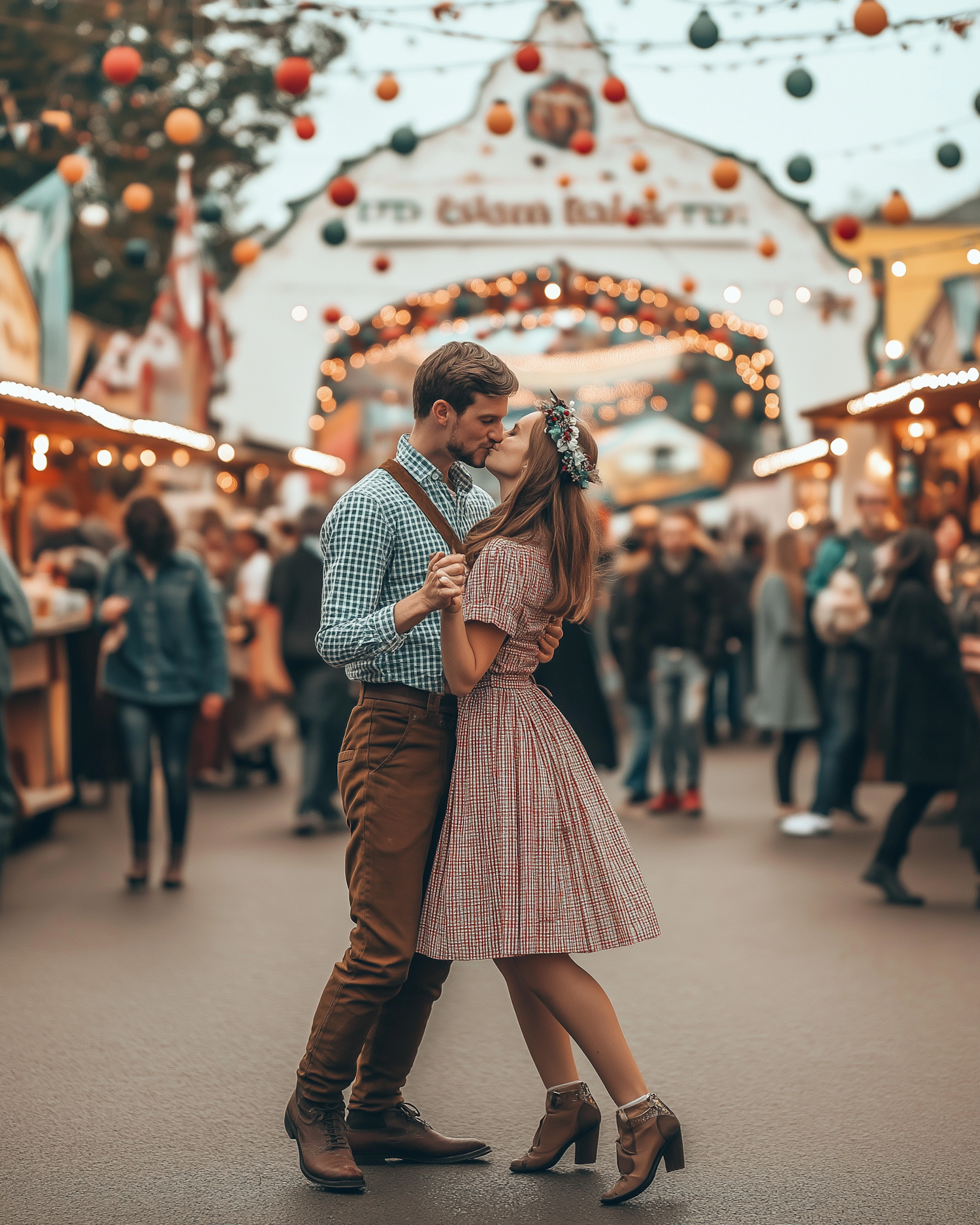 Romantic couple embracing at a lively outdoor festival with colorful decorations and festive lights.