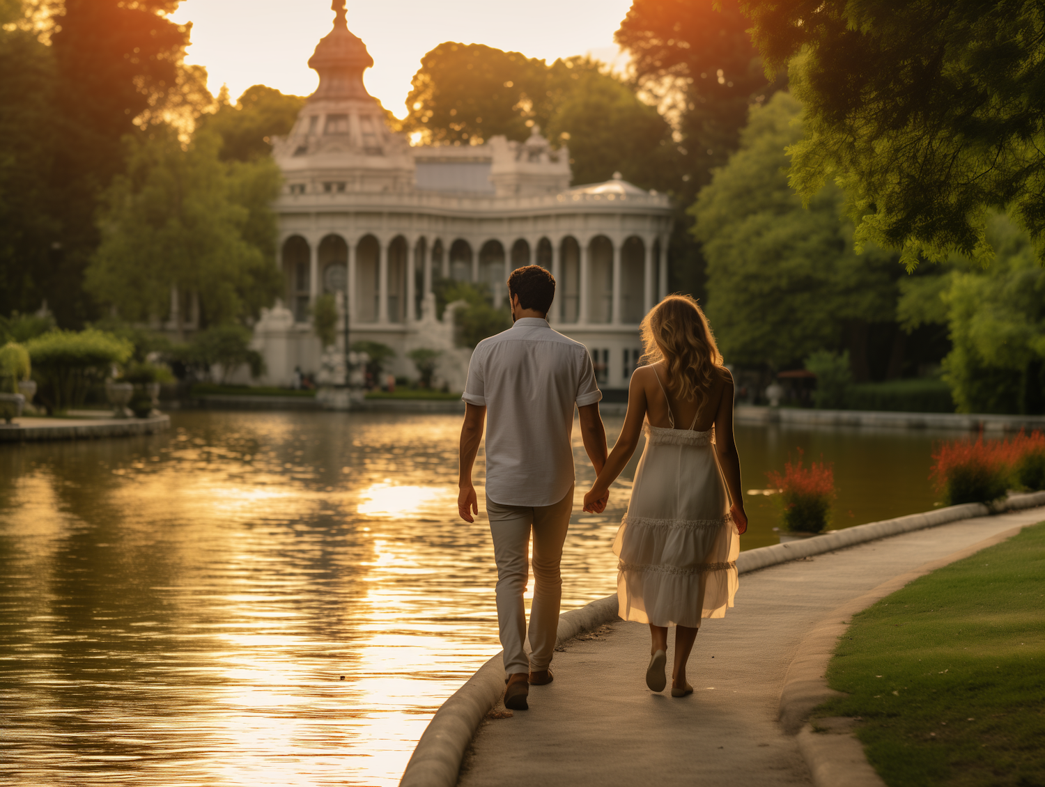 A couple strolls by a lake at sunset, hand in hand, with a grand building in the background, creating a romantic and serene scene.