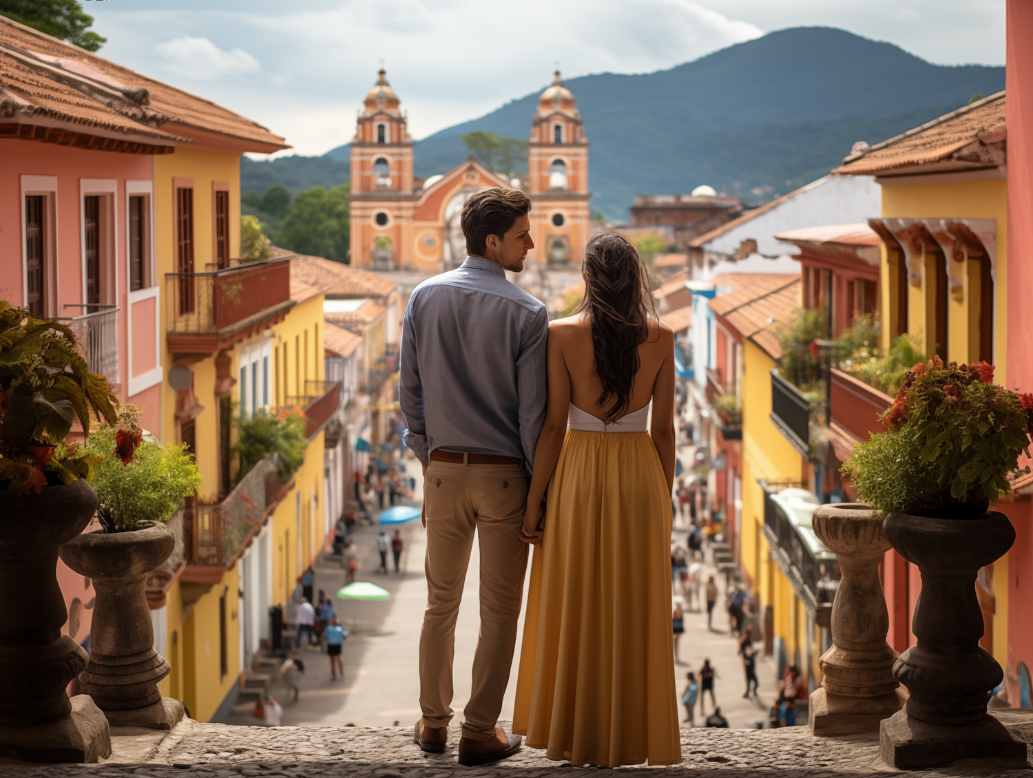 Couple overlooking a vibrant street with colorful buildings and a grand church in the background, set against lush green hills.