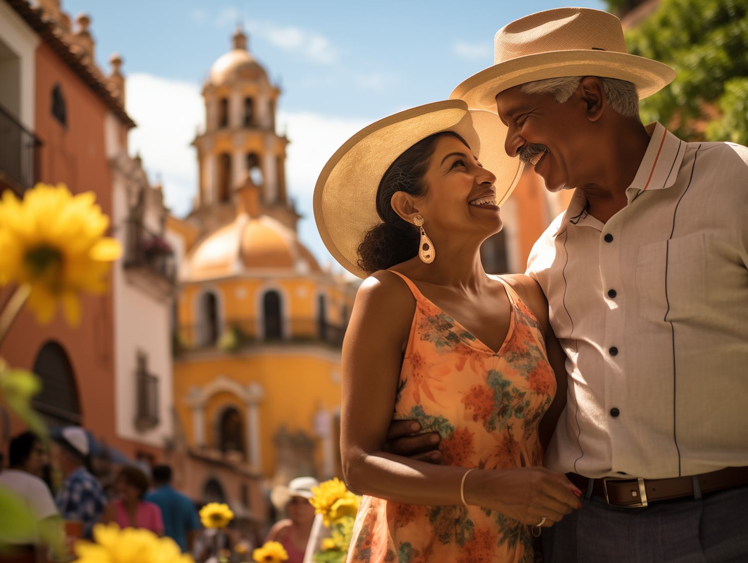 Smiling couple in straw hats enjoying a sunny day near a vibrant church, surrounded by yellow flowers and a lively atmosphere.