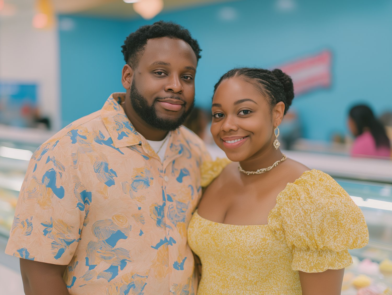 A smiling couple in a colorful indoor setting, wearing stylish outfits, with a dessert counter in the background.