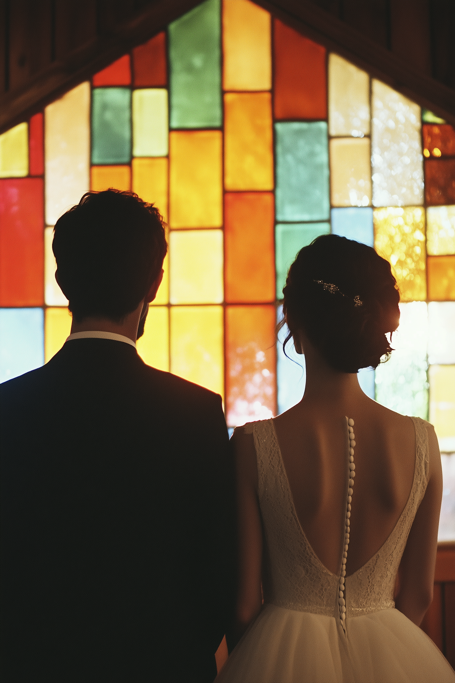 A couple stands before a colorful stained glass window, the bride in a white dress and the groom in a black suit, creating a serene scene.