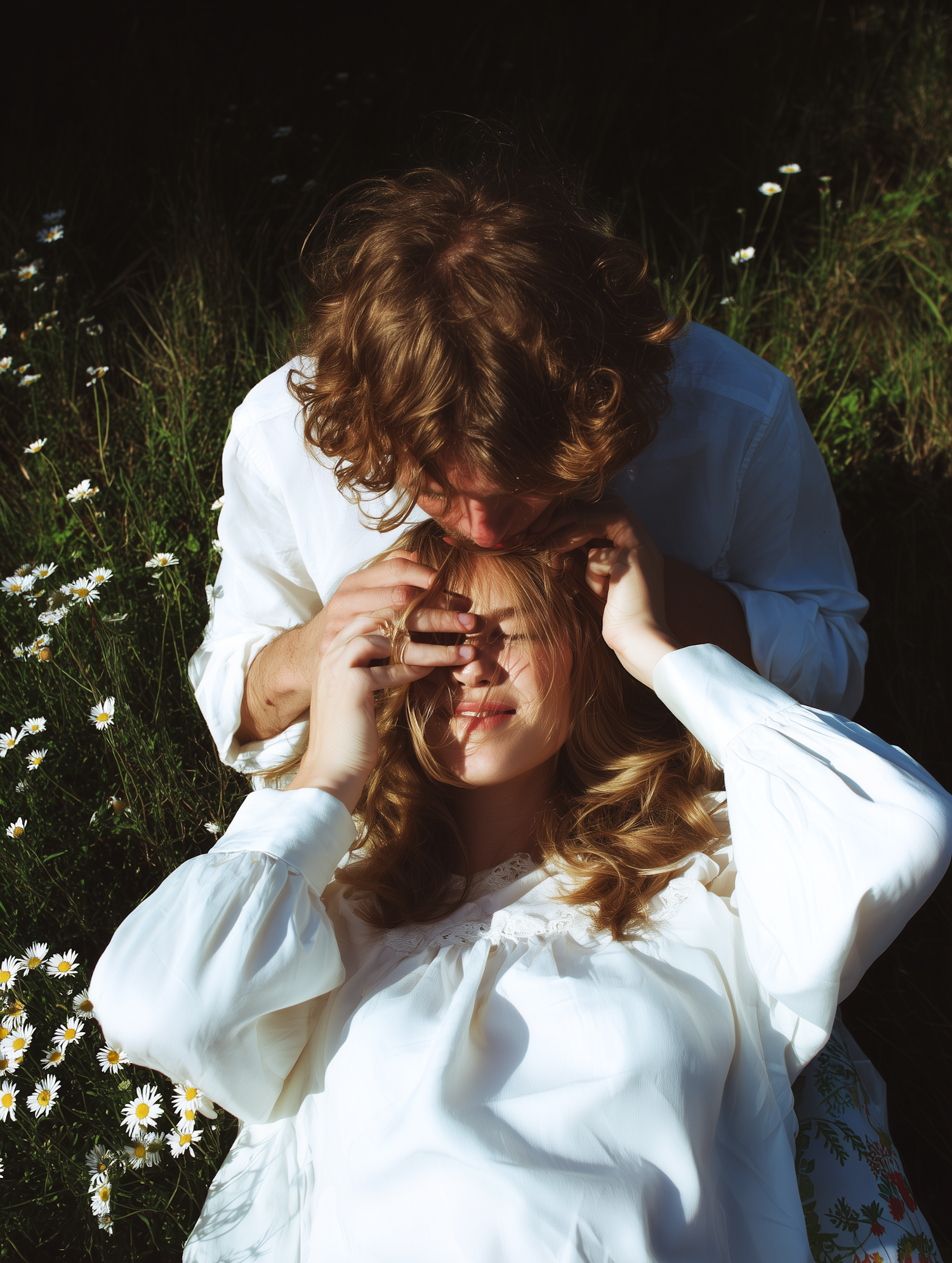 A couple lying together in a sunlit meadow surrounded by daisy flowers, emanating warmth and serenity.