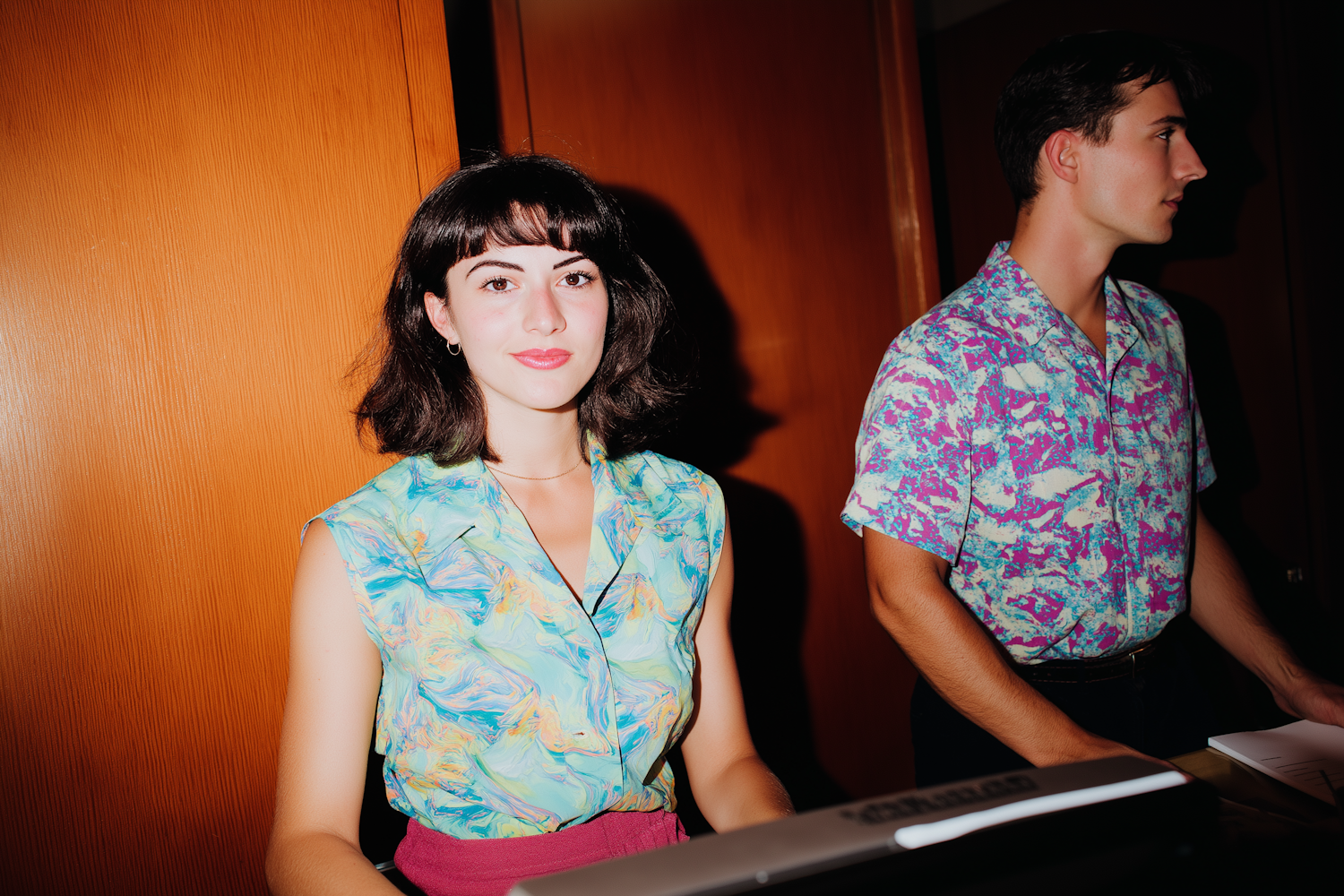 A young woman in a colorful blouse smiles at the camera, while a man in a vibrant shirt looks away, set against a wooden backdrop.